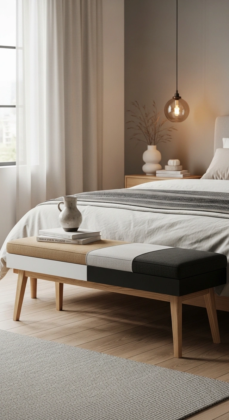 A two-tone bench adds visual interest through color contrast. Choose a combination like light wood with white, or black with natural tones. This contrast creates a modern look without needing extra décor. Place it at the foot of your bed to draw attention and define the space.