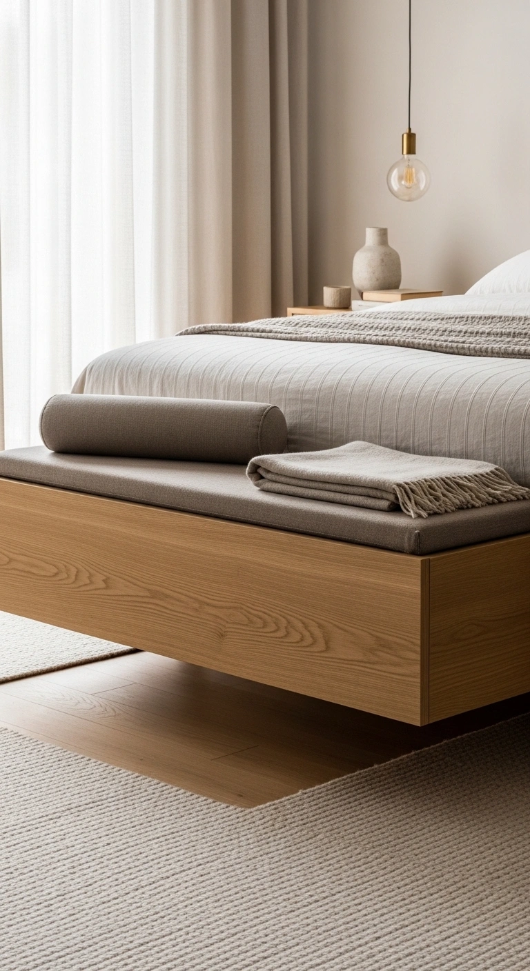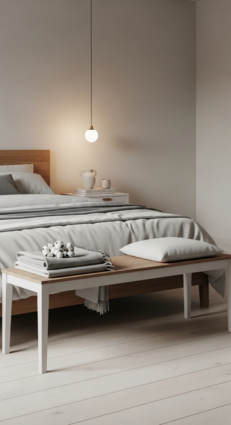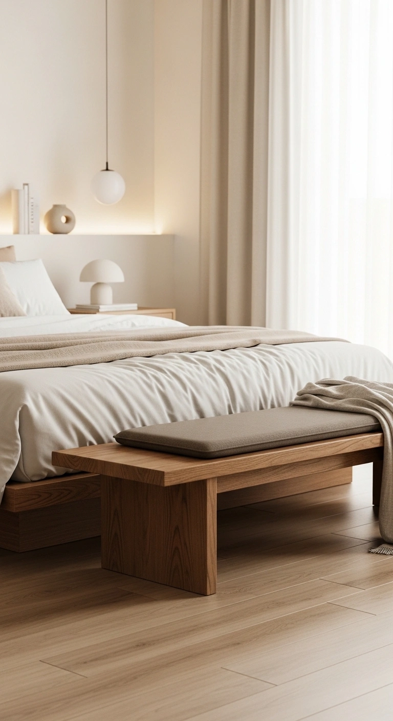 A low platform bench creates a calm and grounded feel in your bedroom. Its lower height makes the room look more relaxed and balanced. Choose a simple wooden design with a wide surface and pair it with a thin cushion for comfort. Place it at the foot of the bed to anchor the space.