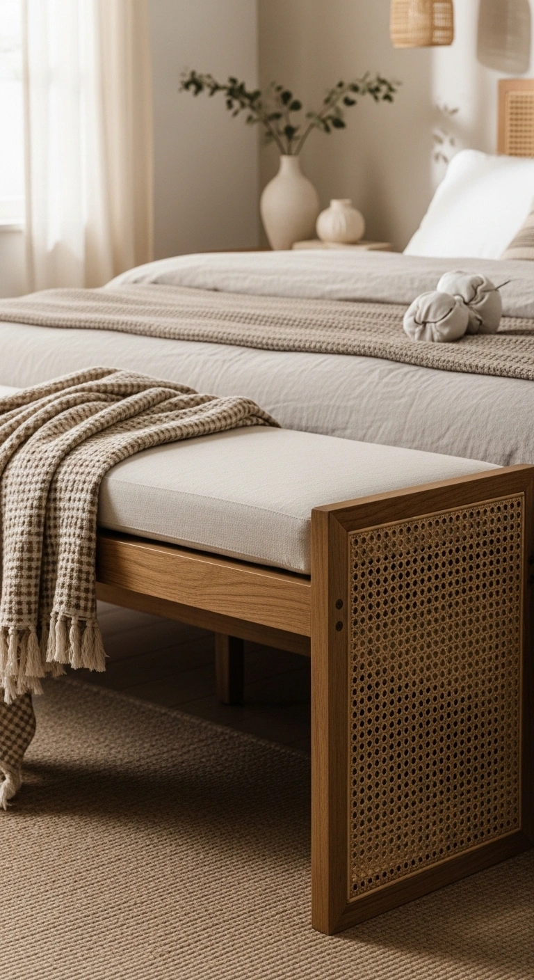 A bench with cane or rattan paneling adds a soft, breathable texture that feels light and stylish. The woven detail creates visual interest without being too bold. Choose a wooden frame in warm tones and pair it with a neutral cushion to keep the look calm and inviting. Place it at the foot of the bed to create a gentle focal point.
