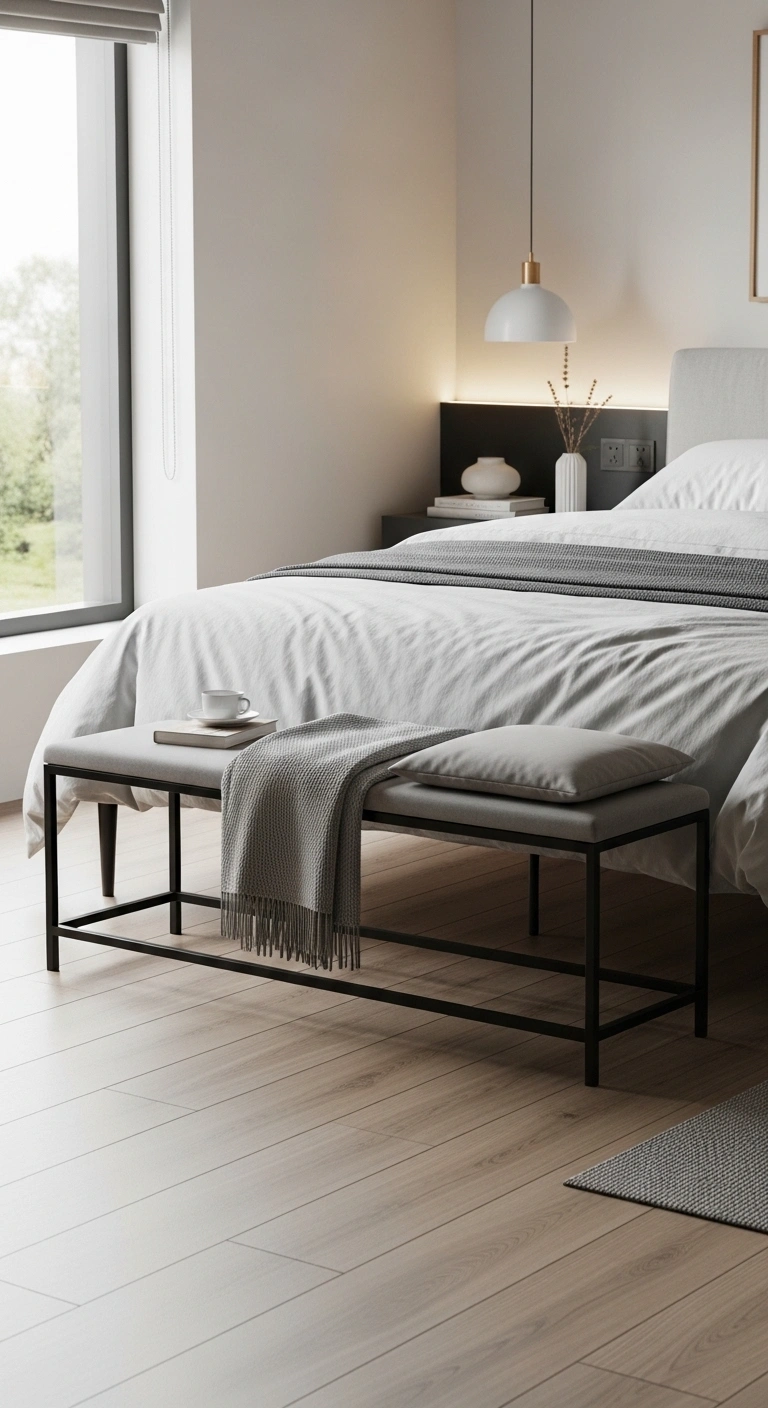 A slim metal frame bench works perfectly in narrow or compact bedrooms. Its thin structure keeps the room from feeling crowded while still adding function. Choose finishes like matte black or brushed gold for a modern touch. Add a simple upholstered seat to make it comfortable and visually balanced.