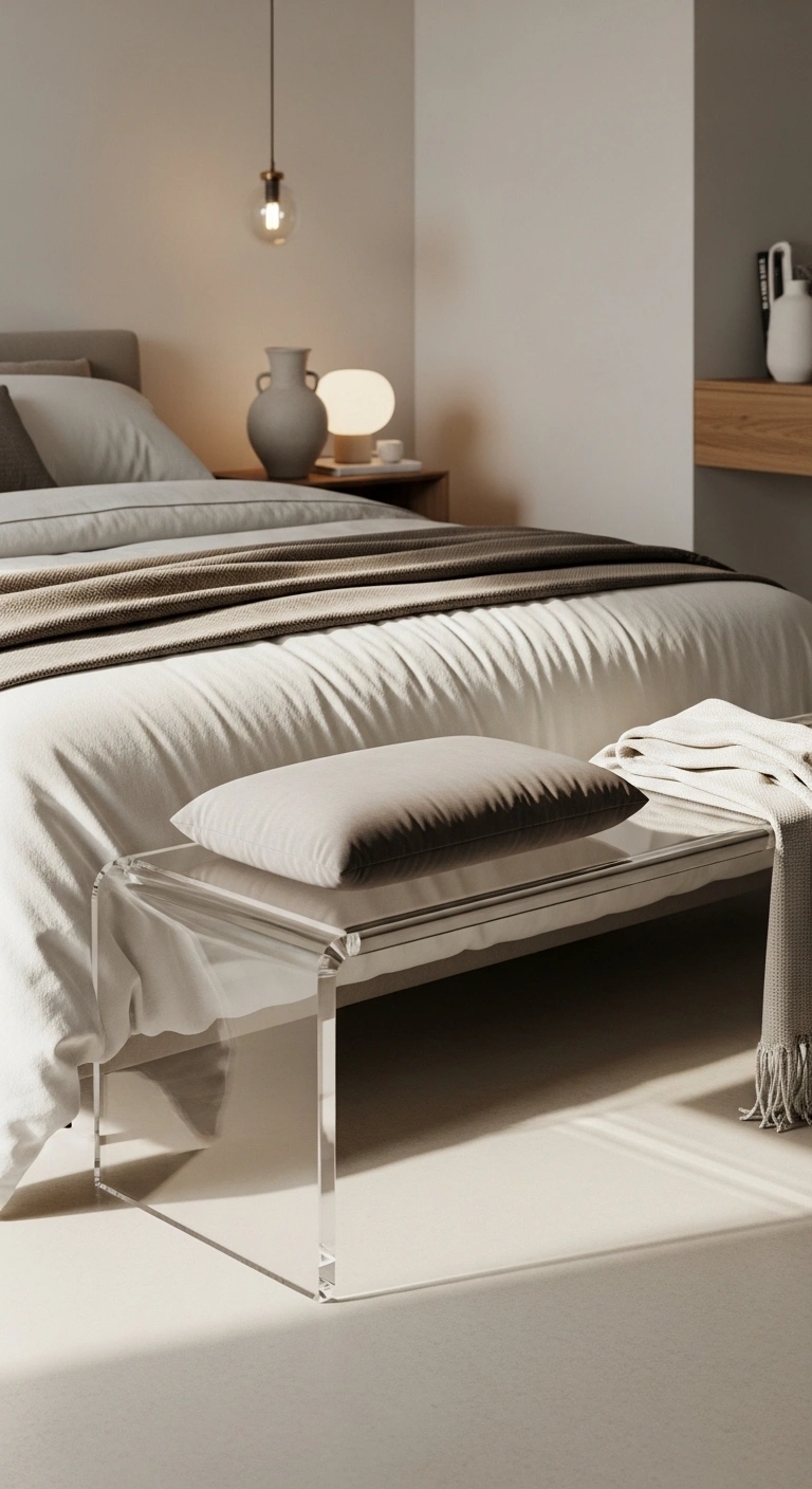 An acrylic bench adds function without taking up visual space. Its transparent design makes it almost invisible, which helps keep your bedroom feeling open and uncluttered. Pair it with a soft cushion in a neutral tone to balance the sleek material. Place it at the foot of the bed or near a vanity area.