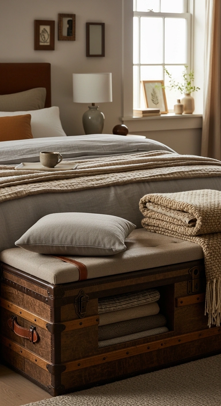 A vintage trunk bench combines storage with strong visual character. Use an old-style trunk with leather straps or wood detailing and place a soft cushion on top to make it comfortable. Position it at the foot of your bed to create a bold and functional centerpiece.