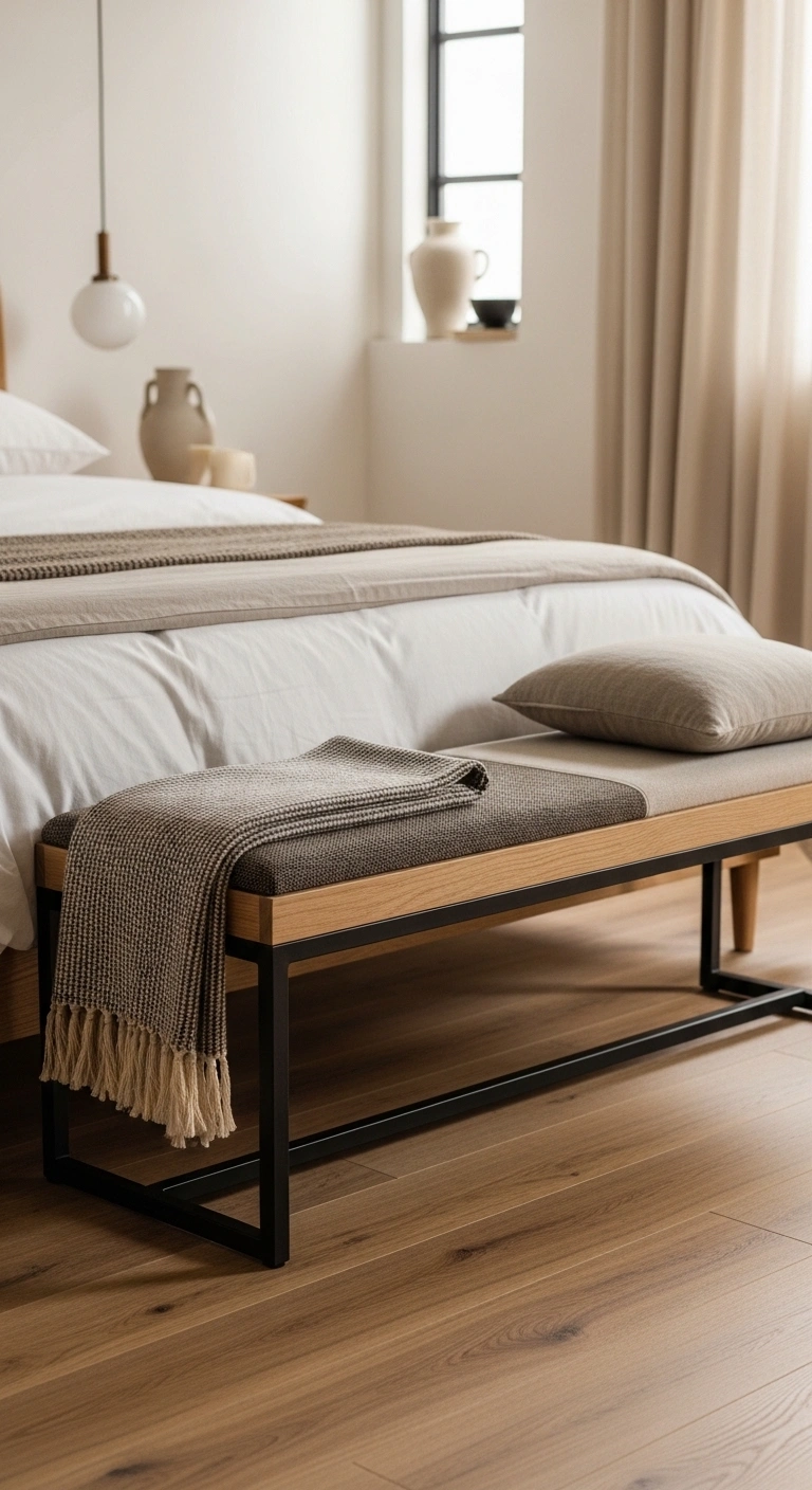 A mixed-material bench blends elements like wood, metal, and fabric to create a layered look. Choose a design where each material stands out but still feels balanced. For example, a wooden base with metal legs and a soft upholstered seat creates contrast and interest. Place it at the foot of your bed for maximum impact.