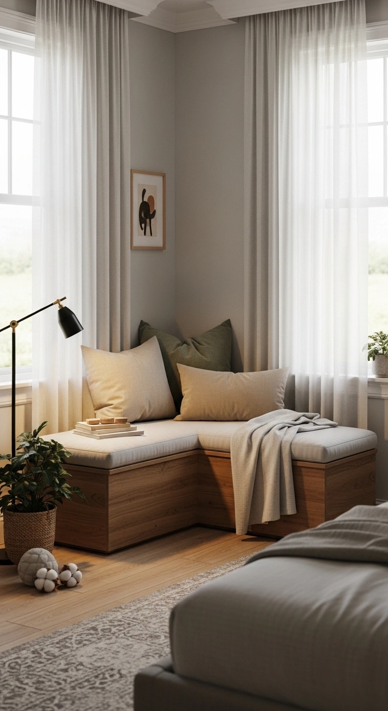 A corner bench makes use of space that often goes unused. Place it in an empty corner near a window or beside a wardrobe to create a cozy sitting spot. Choose a compact design with soft upholstery to keep it comfortable and inviting. Use colors that match your room to keep the look cohesive.