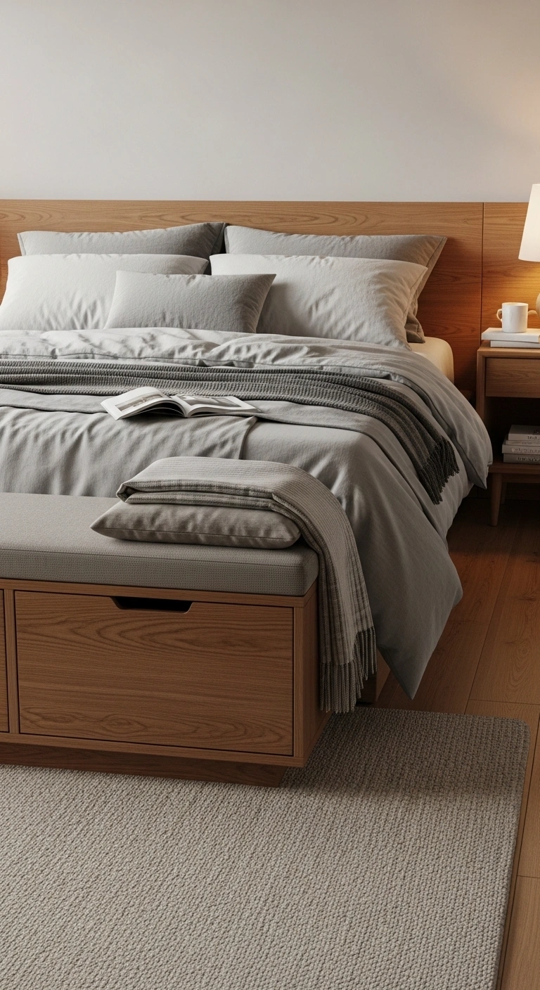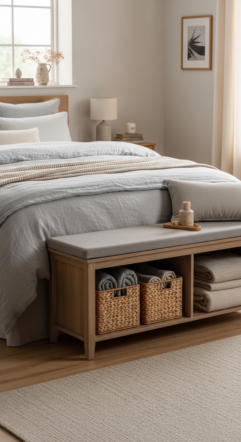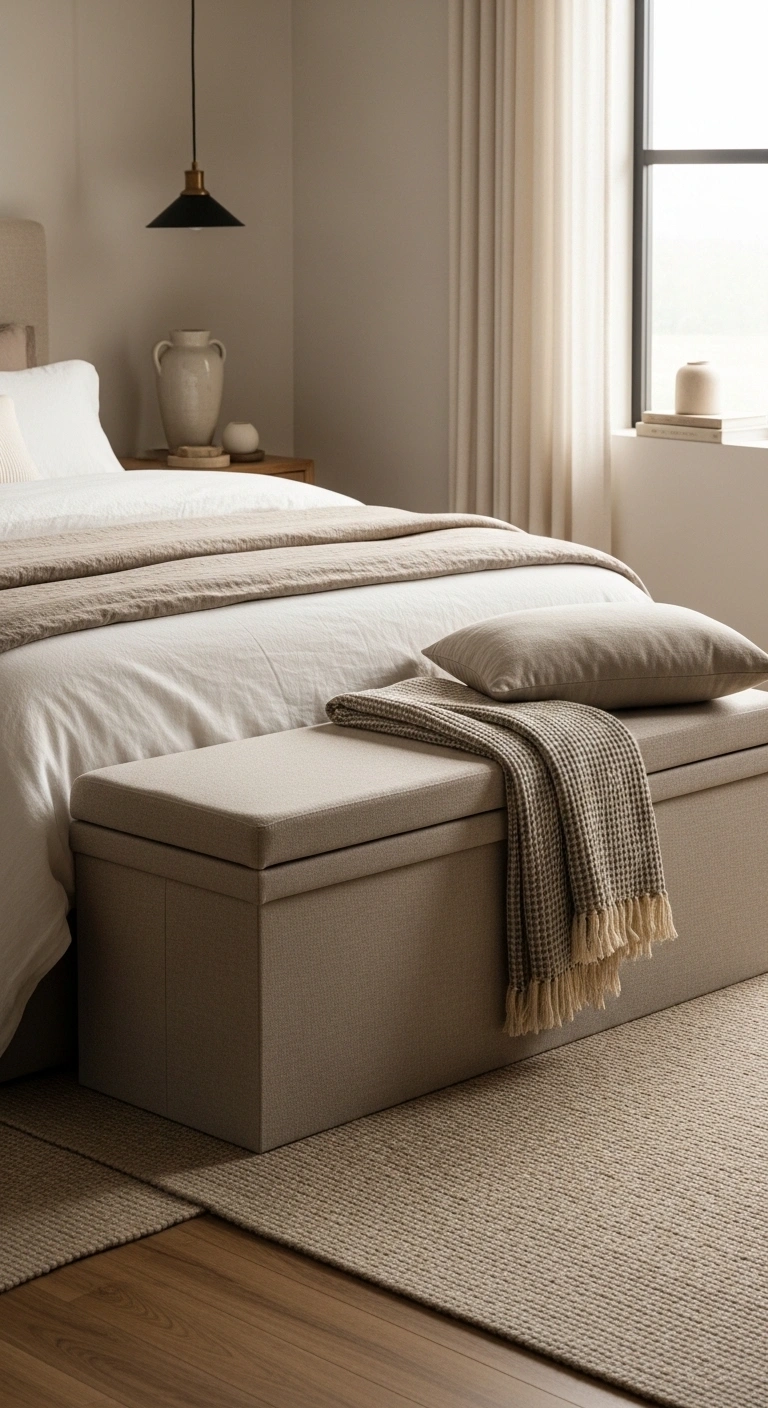 An upholstered bench with hidden storage gives you comfort and a smart place to store items you use often. Place it at the foot of your bed and choose a soft fabric like linen or velvet in warm tones such as beige, dusty rose, or soft gray. The padded top makes it perfect for sitting while getting ready, while the inside space keeps extra blankets, pillows, or seasonal clothes out of sight.