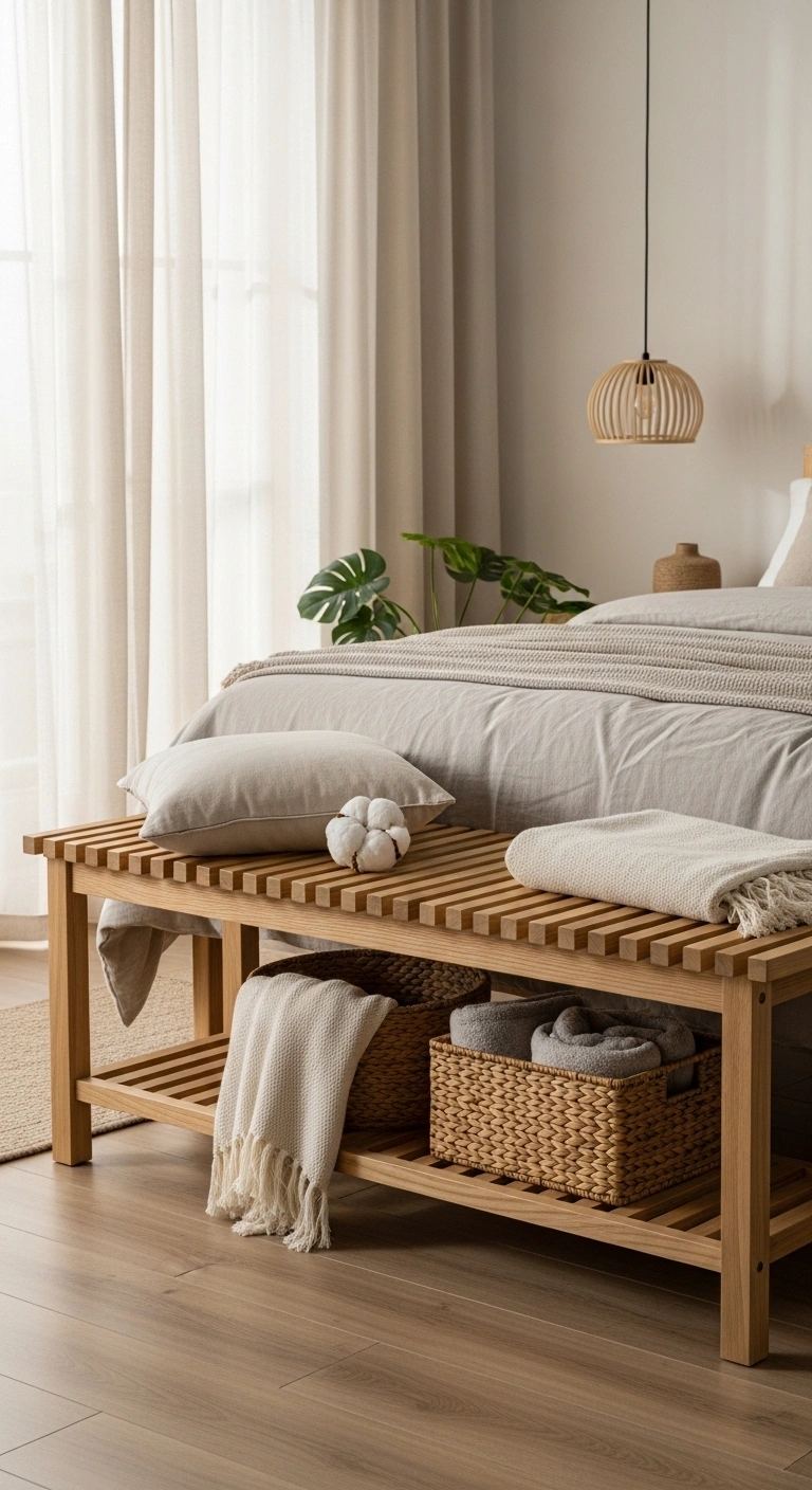 A bench with an open shelf gives you easy access to everyday items. The top works as a seating area, while the lower shelf holds baskets, books, or folded blankets. Choose a design with a sturdy frame in wood or metal for durability and style. Place it at the foot of your bed for a balanced layout.