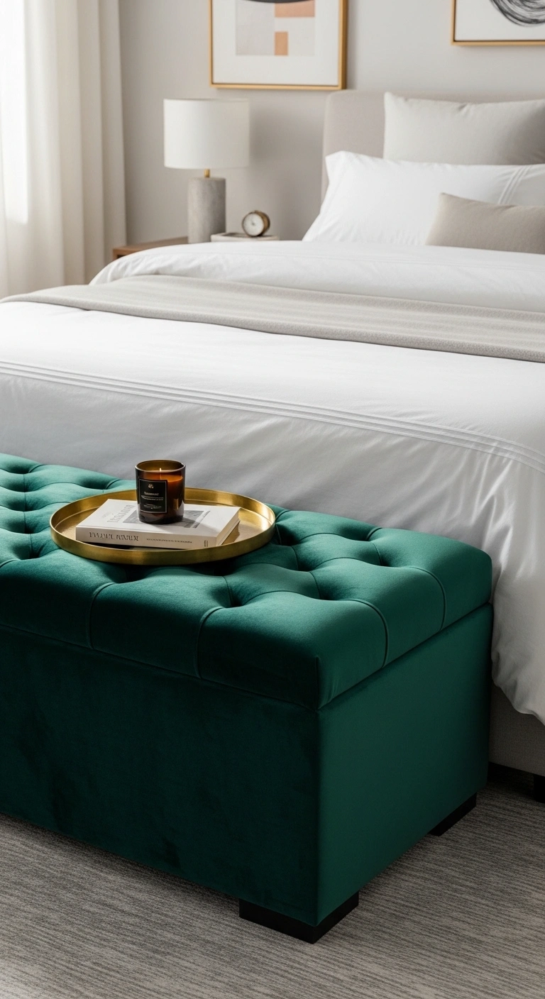 A tufted velvet bench instantly adds richness and depth to your bedroom. Choose deep colors like emerald green, navy blue, or charcoal to create a bold focal point. The tufted design adds texture, while the velvet reflects light in a soft, elegant way. Place it at the foot of your bed to anchor the entire room visually.