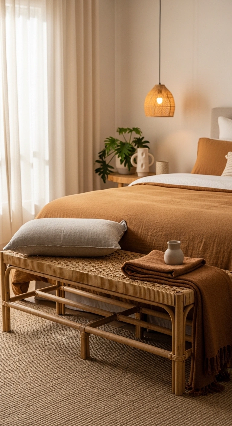 A woven bench adds texture and warmth to your bedroom without making it feel heavy. Look for designs made from materials like rattan, jute, or rope. These materials create a relaxed and inviting feel. Place the bench near the foot of your bed or in a corner to soften the overall look of the room.