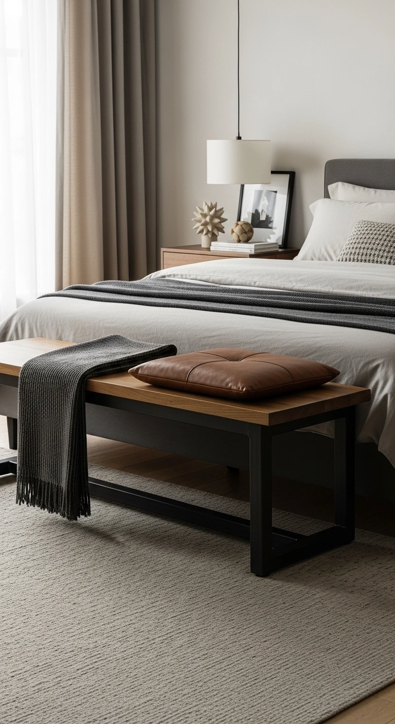 An industrial bench combines metal and wood for a bold and structured look. Choose a design with black metal legs and a solid wood top in a warm finish. This contrast creates a strong visual statement while still feeling practical. Place it at the foot of your bed to ground the space.