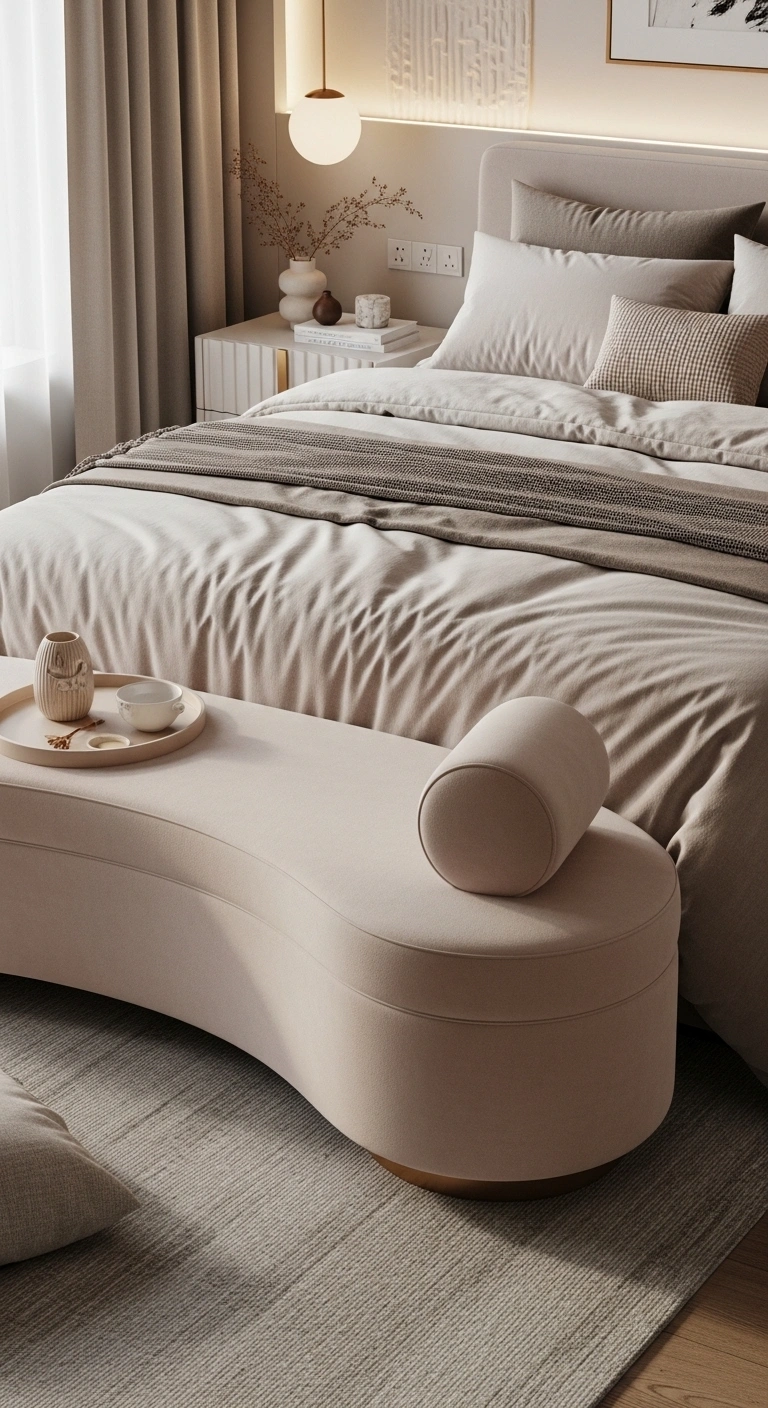 A curved bench adds a unique shape that breaks away from straight lines. The gentle curve creates a softer, more inviting look in your bedroom. Choose upholstery in soft tones like blush, cream, or light gray to enhance the calming effect. Place it at the foot of your bed to create a smooth visual flow.