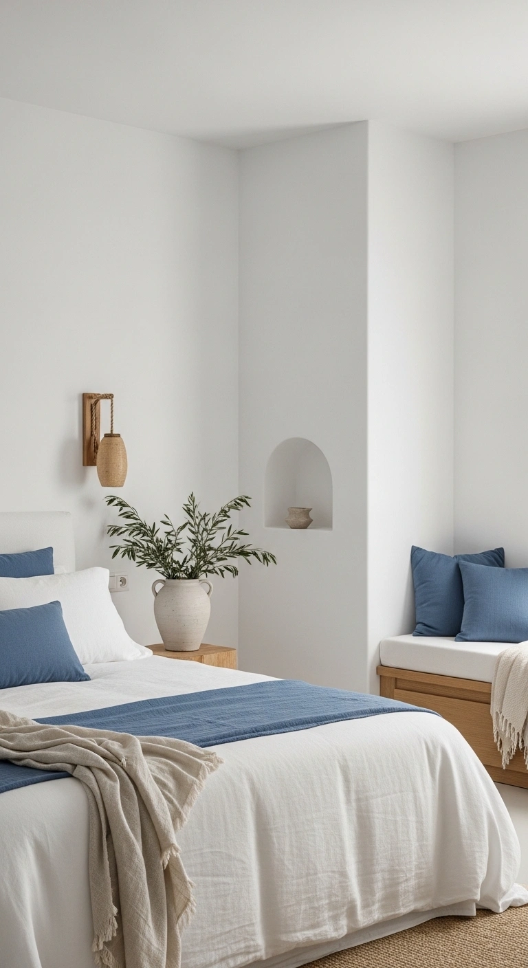Choose natural fabrics like cotton or linen in off-white or sand tones for your bedding. Then layer one or two blue elements to create contrast. You can even use subtle patterns like thin stripes or soft geometric prints. Keep the rest of the room neutral so the blue stands out without overwhelming the space. This approach works especially well if you want a Mediterranean bedroom style without committing to permanent changes.