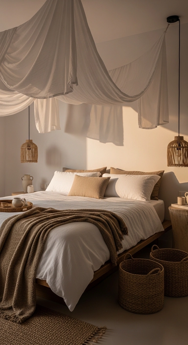 Add warmth to your bedroom with woven materials like rugs, baskets, and throws. These textures bring a handmade feel that connects the space to nature. Choose items made from jute, cotton, or wool in soft, natural colors.