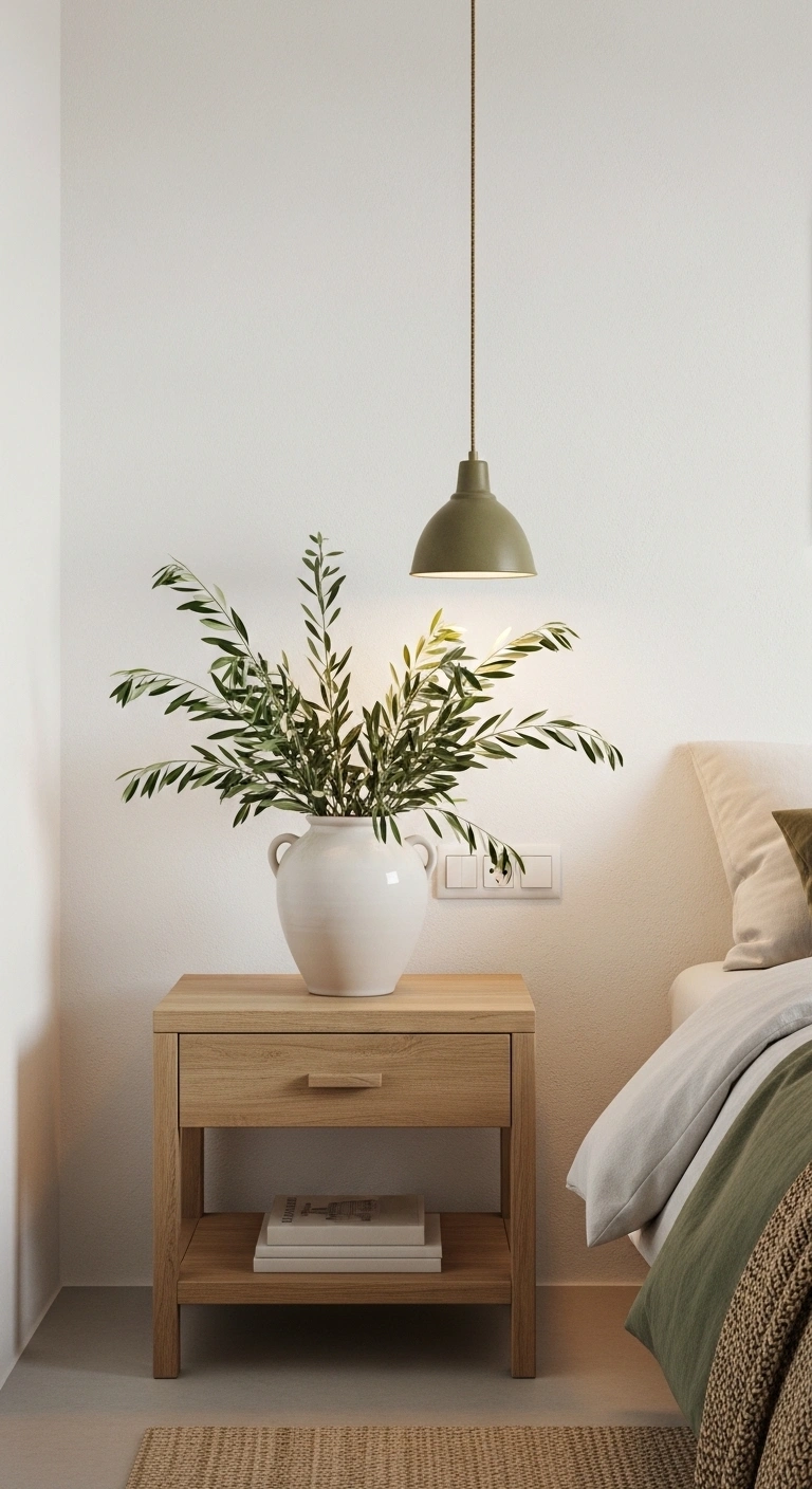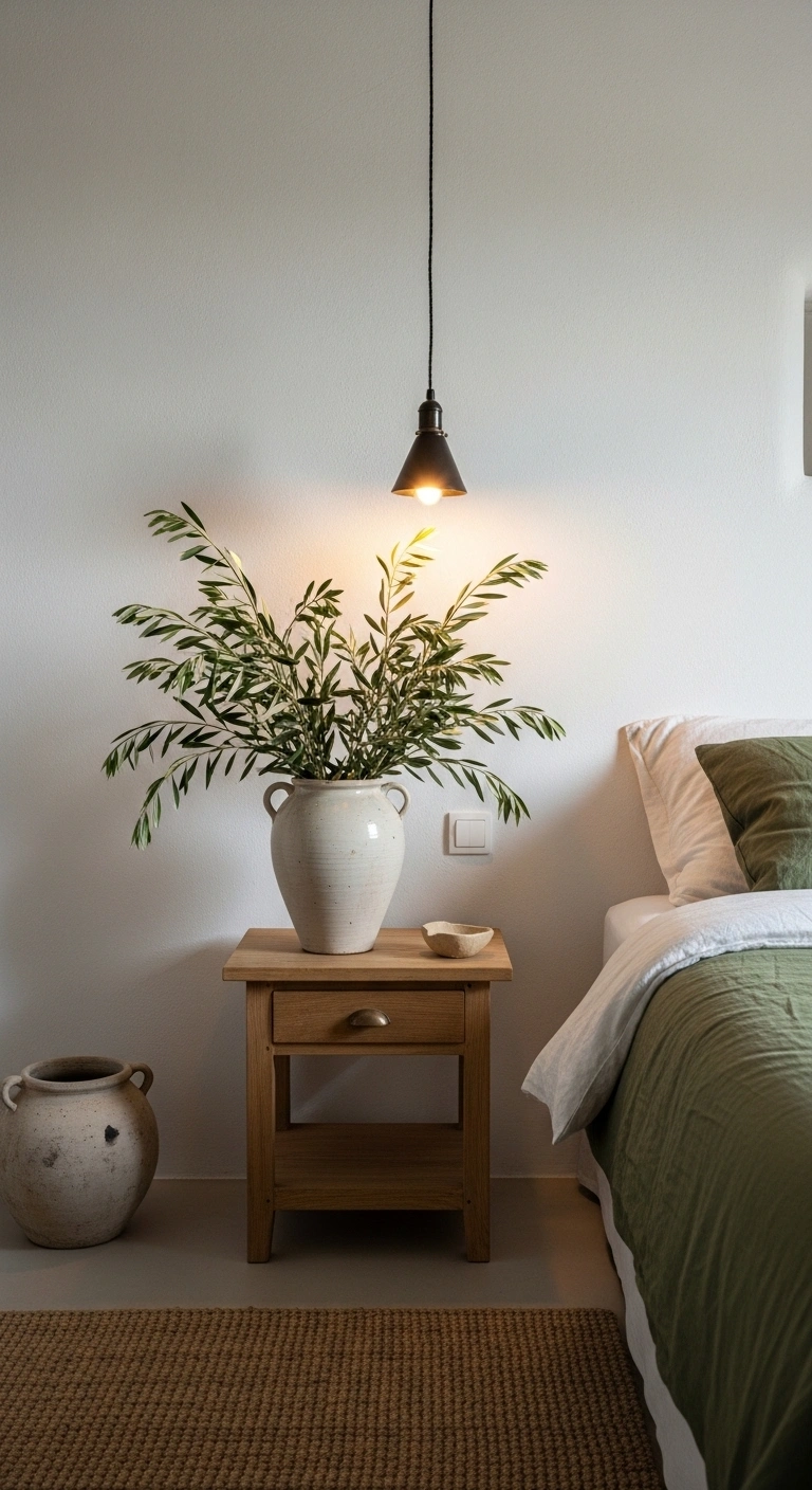 Choose real or high-quality faux branches with soft green-gray tones. Keep the arrangement loose and natural, not tightly structured. Pair them with neutral surroundings so the greenery stands out gently. Olive tones blend beautifully with white walls, wood textures, and linen fabrics. This small detail adds life to the room without making it feel busy, helping you create a truly Mediterranean-inspired bedroom space.