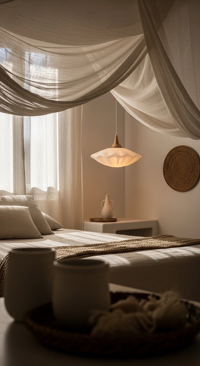 A light canopy above the bed adds a dreamy Mediterranean feel without making the room heavy. Instead of thick fabric, use sheer linen or cotton that allows air and light to pass through. The goal is softness, not drama.