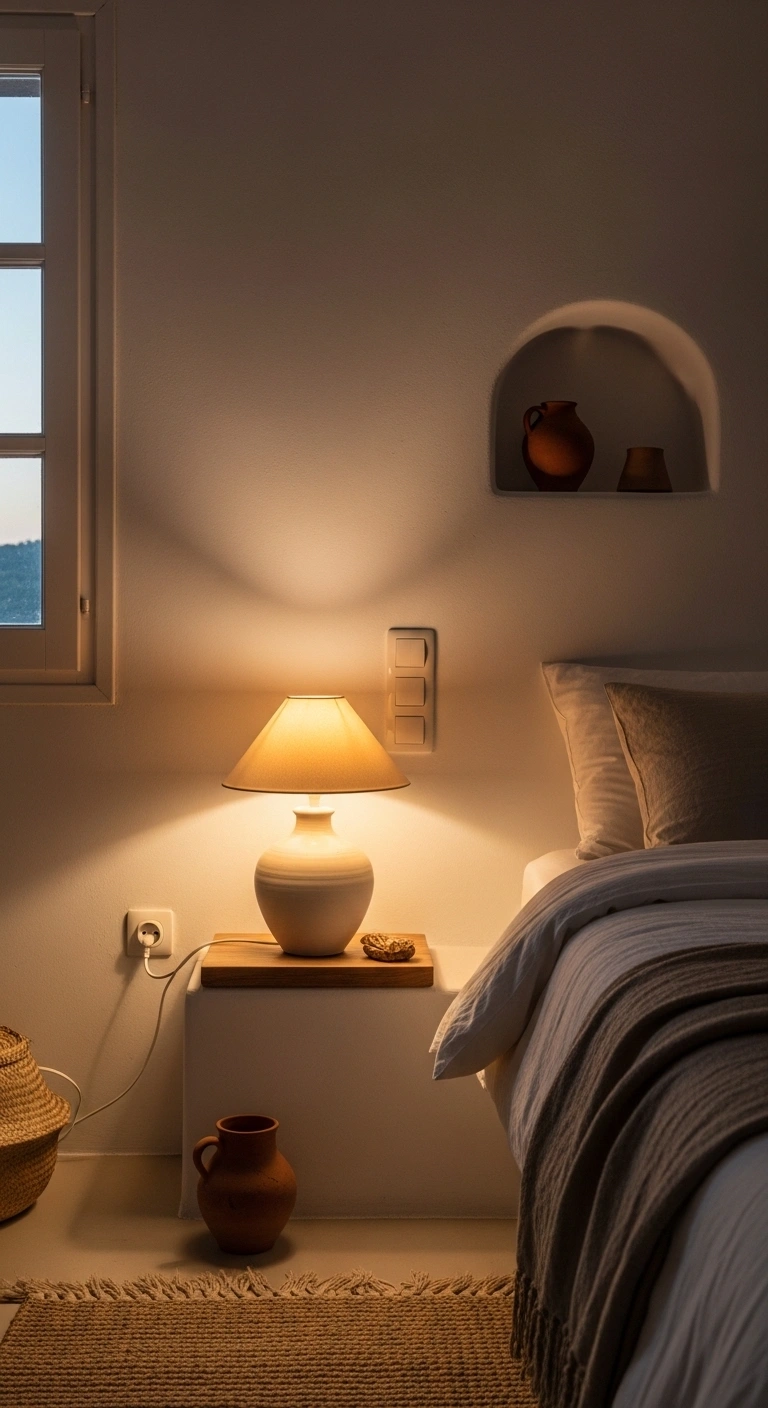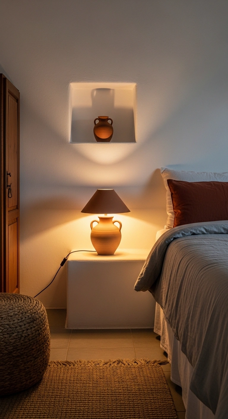 Lighting plays a huge role in Mediterranean design. Instead of modern harsh fixtures, choose lamps or pendants made from clay or ceramic materials. These create a warm, earthy glow that feels natural and inviting.