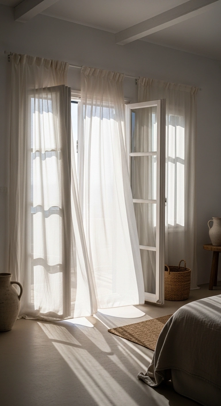 Heavy curtains block the soft glow that defines Mediterranean spaces. Instead, use light linen curtains that allow sunlight to pass through while still giving privacy. The fabric should move gently with air, adding a sense of life to the room.