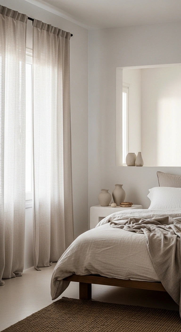 Choose neutral shades like white, ivory, or soft beige. Hang them slightly higher than the window frame to make the room feel taller. During the day, keep them open or loosely closed to let filtered light fill the space. This creates a calm and natural atmosphere that changes with the sun. Linen also adds a soft texture that fits perfectly with Greek bedroom decor.