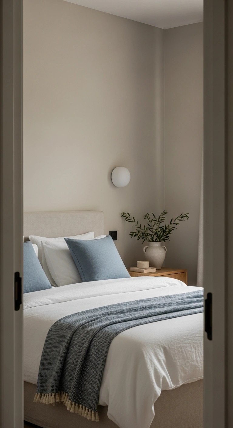 Use warm, low lighting placed at different heights instead of one bright ceiling light. A small bedside lamp with a linen shade or a wall-mounted light creates soft shadows that move across the wall. Pair this with light cotton bedding and minimal decor. Keep furniture simple and slightly spaced out so the room feels airy. The key is not the white color alone, but how the light interacts with it throughout the day.