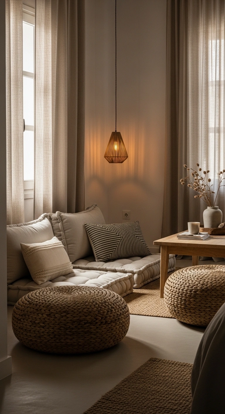 Instead of relying only on chairs, add soft floor seating to create a relaxed Greek island vibe. Use floor cushions, low poufs, or woven mats in natural fabrics. This makes the room feel informal and comfortable.