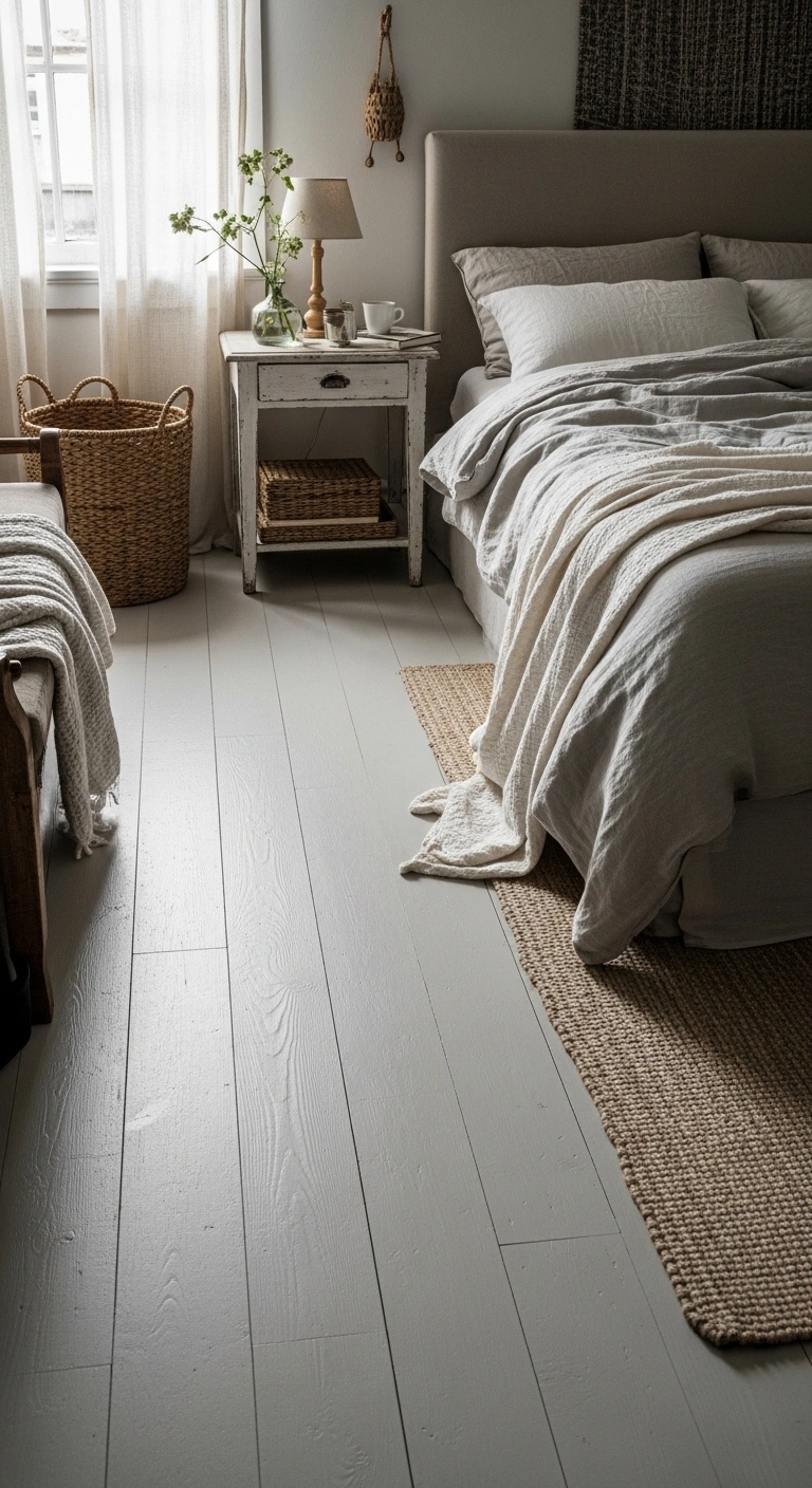 Let some of the natural wood texture show through for added character. Pair this flooring with soft, layered fabrics—linen bedding, cotton throws, and light curtains. Keep furniture simple and slightly weathered for a cohesive look. This idea works well if you want something unique that feels both cozy and personal.