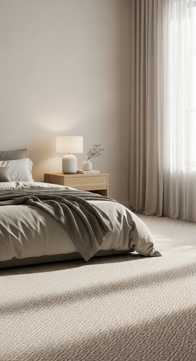 Patterned carpet flooring adds quiet style while keeping the bedroom soft and cozy. Choose subtle designs like faded geometric shapes or tone-on-tone stripes in warm neutrals. These patterns create movement without making the space feel busy.