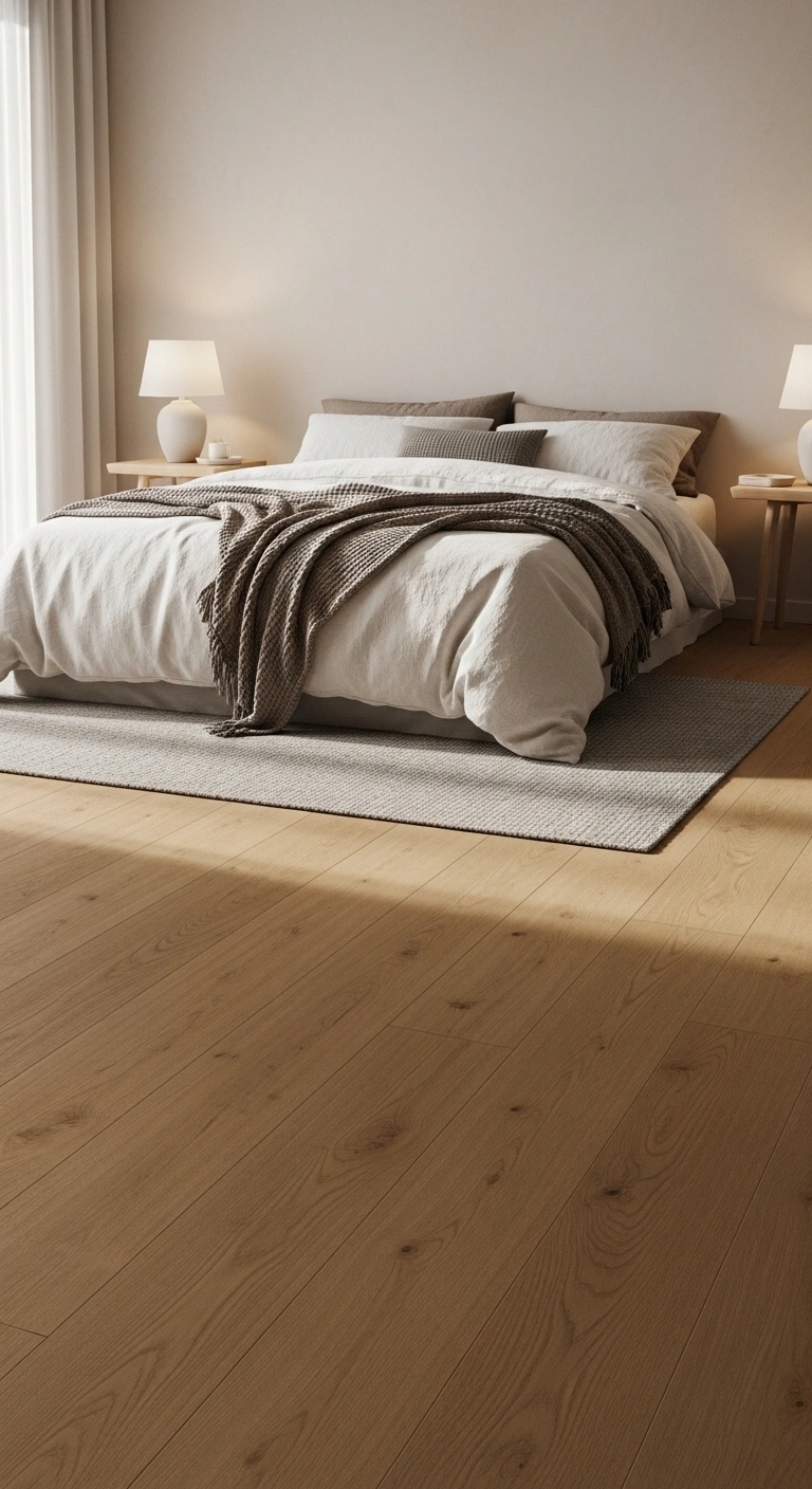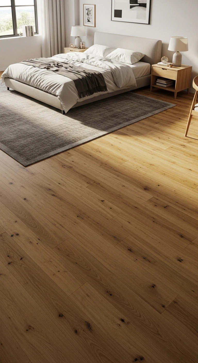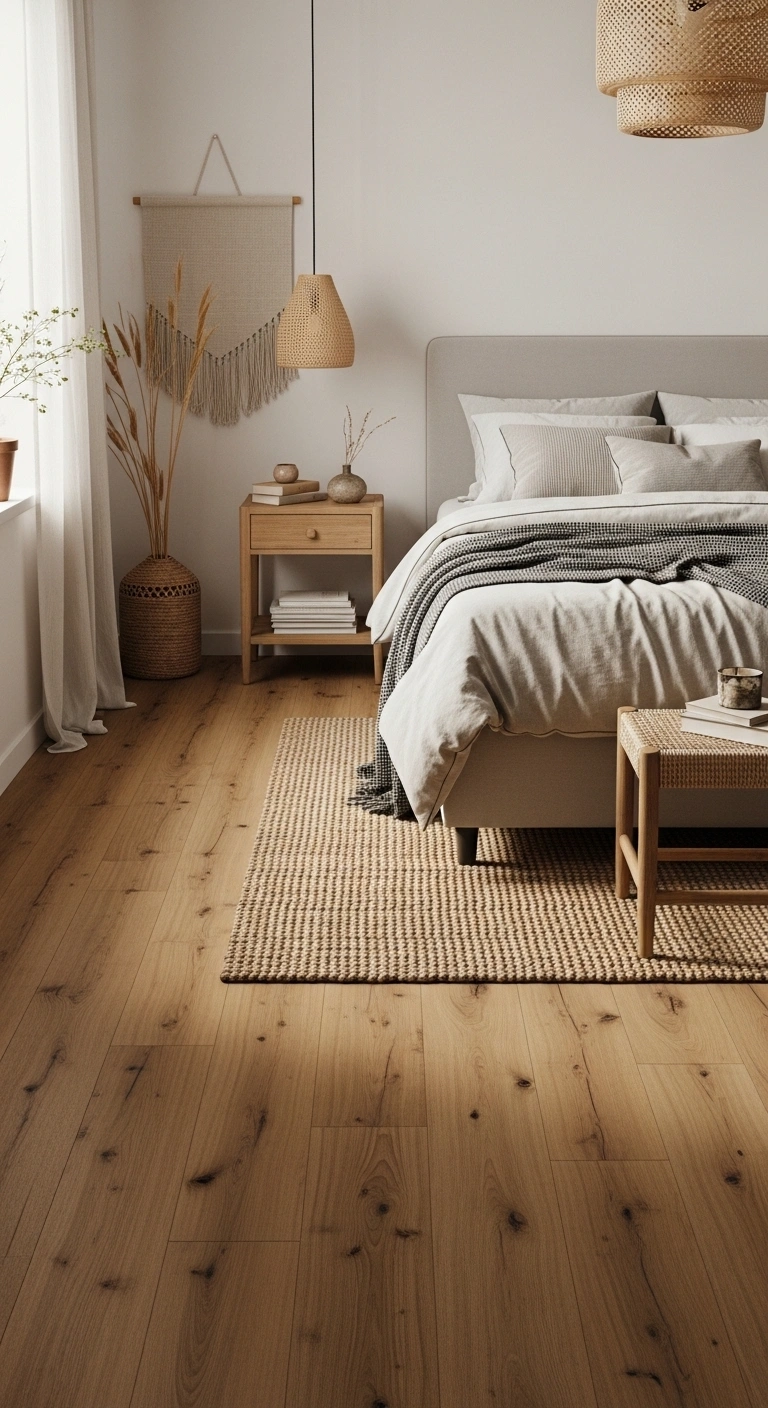 Choose warm tones like honey oak or soft walnut for a cozy finish. Add a large area rug that sits partially under the bed to soften the space. Keep furniture low-profile to enhance the open feel. This setup is perfect for both small and large bedrooms where you want a clean but warm atmosphere.