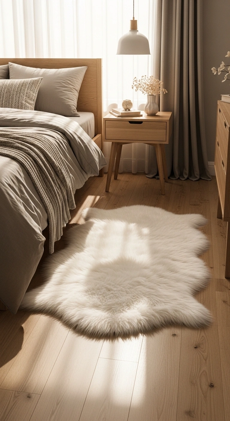 Faux fur rug layering adds instant warmth and comfort without changing your entire floor. Place a soft, fluffy rug next to the bed so your feet land on something warm every morning.