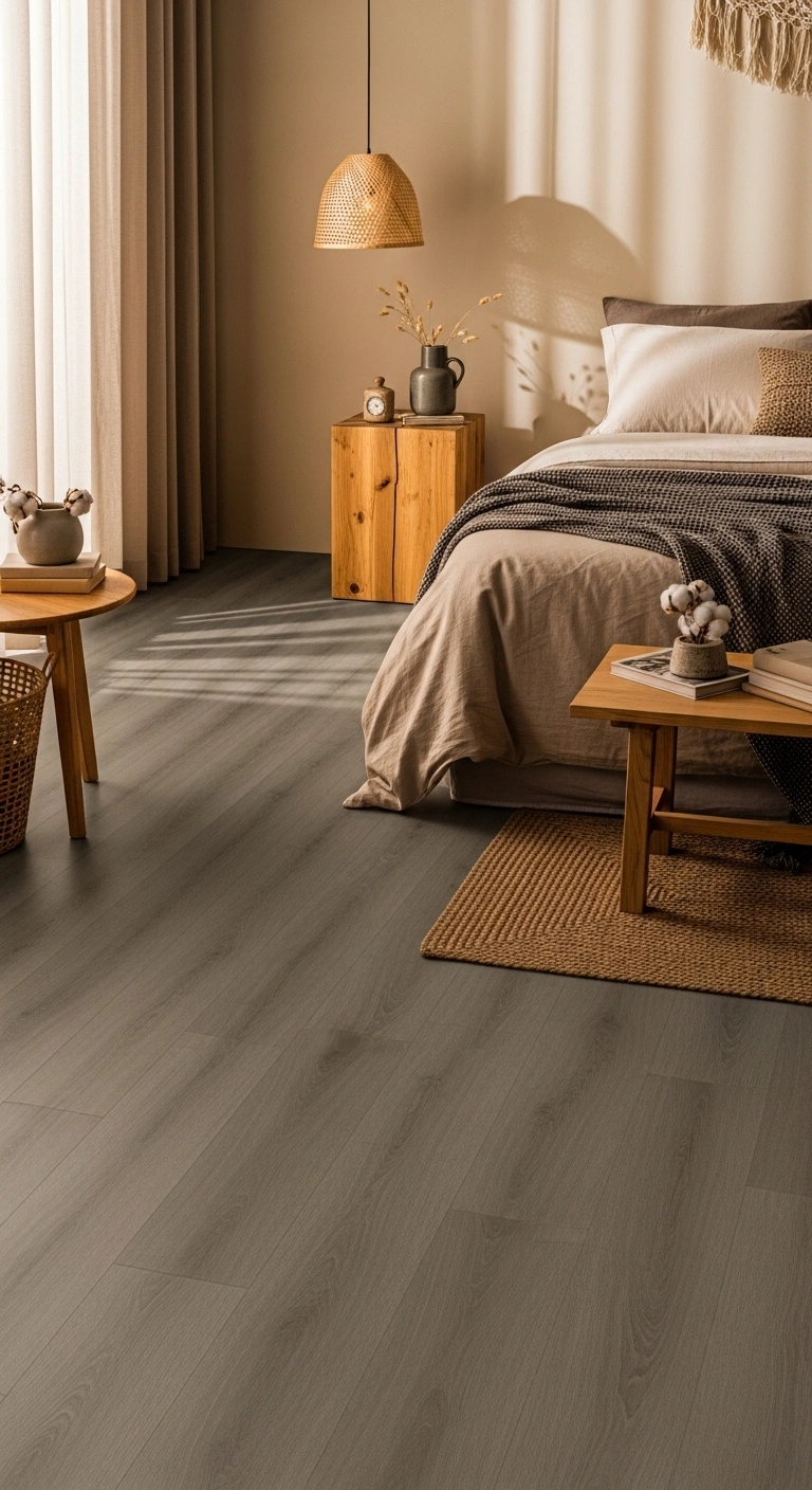 Cork flooring offers a unique combination of softness and warmth. It feels gentle underfoot and naturally reduces noise, making your bedroom feel calm and peaceful.