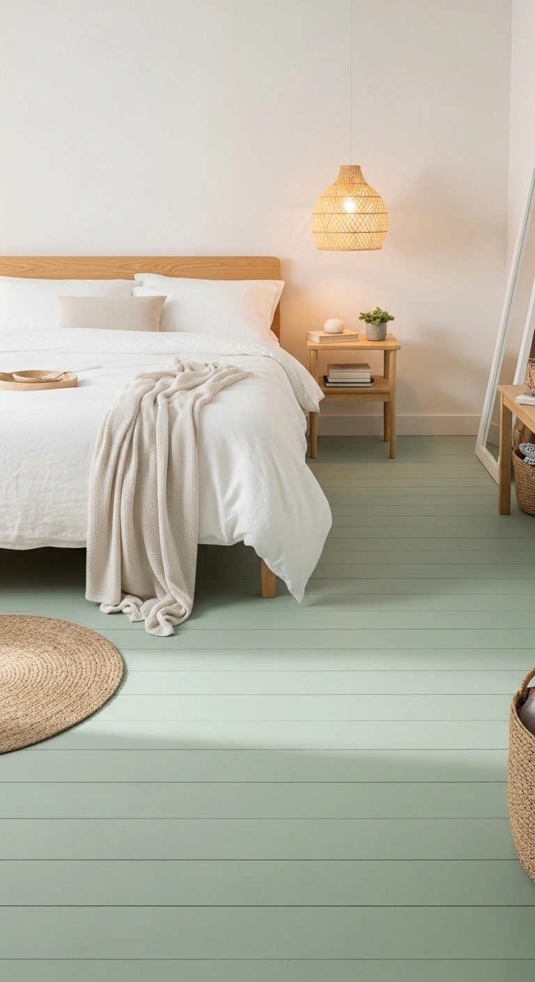 Pastel painted flooring brings a gentle and calming vibe to your bedroom. Colors like pale blue, soft lavender, or muted peach create a peaceful base that feels fresh and light.