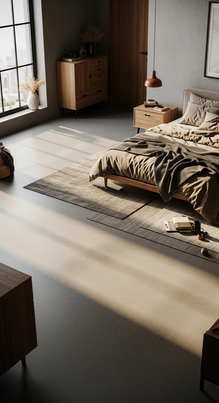 Layer the floor with warm rugs, soft throws, and textured cushions. Add warm lighting and natural elements like wood or plants to balance the cool surface. This contrast creates a stylish, grounded feel that still feels comfortable. It’s a great choice for modern or industrial-style bedrooms.