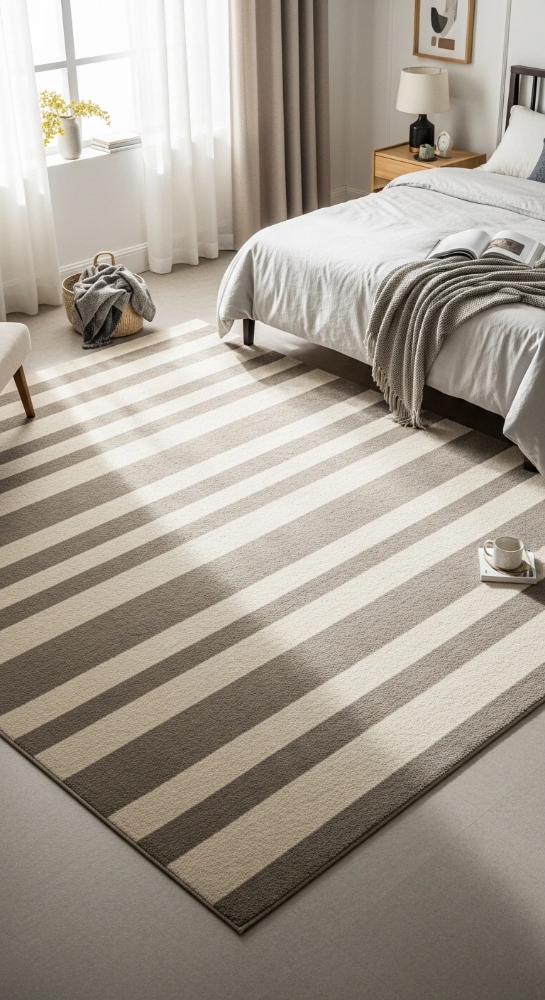 Striped rugs can visually shape your bedroom floor without permanent changes. Horizontal stripes make the room feel wider, while vertical stripes add length.