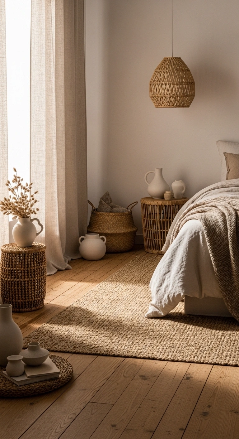 Natural fiber rugs like jute or sisal add earthy texture that instantly warms up any bedroom floor. Their slightly rough texture contrasts beautifully with soft bedding and smooth furniture.