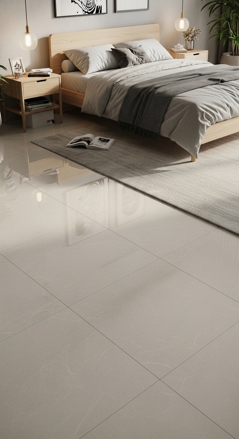 Choose tiles in warm shades like cream or light beige. Place a large, soft rug under the bed to create a cozy zone. Use curtains and bedding in soft textures to reduce the sharpness of the tiles. This mix of smooth and soft creates a balanced space that feels both fresh and inviting.