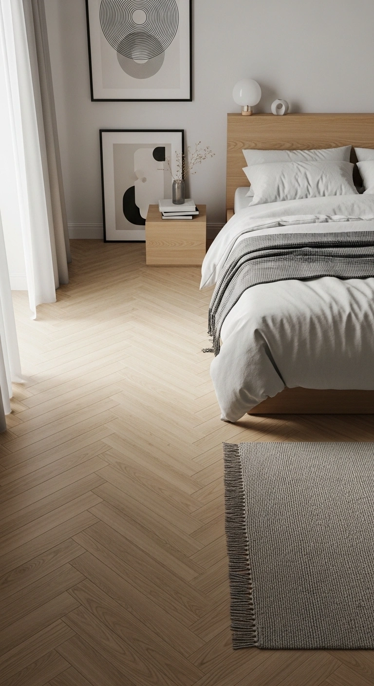 Herringbone wood flooring adds visual interest without being loud or overwhelming. The angled pattern creates movement, making your bedroom feel more dynamic and thoughtfully designed.
