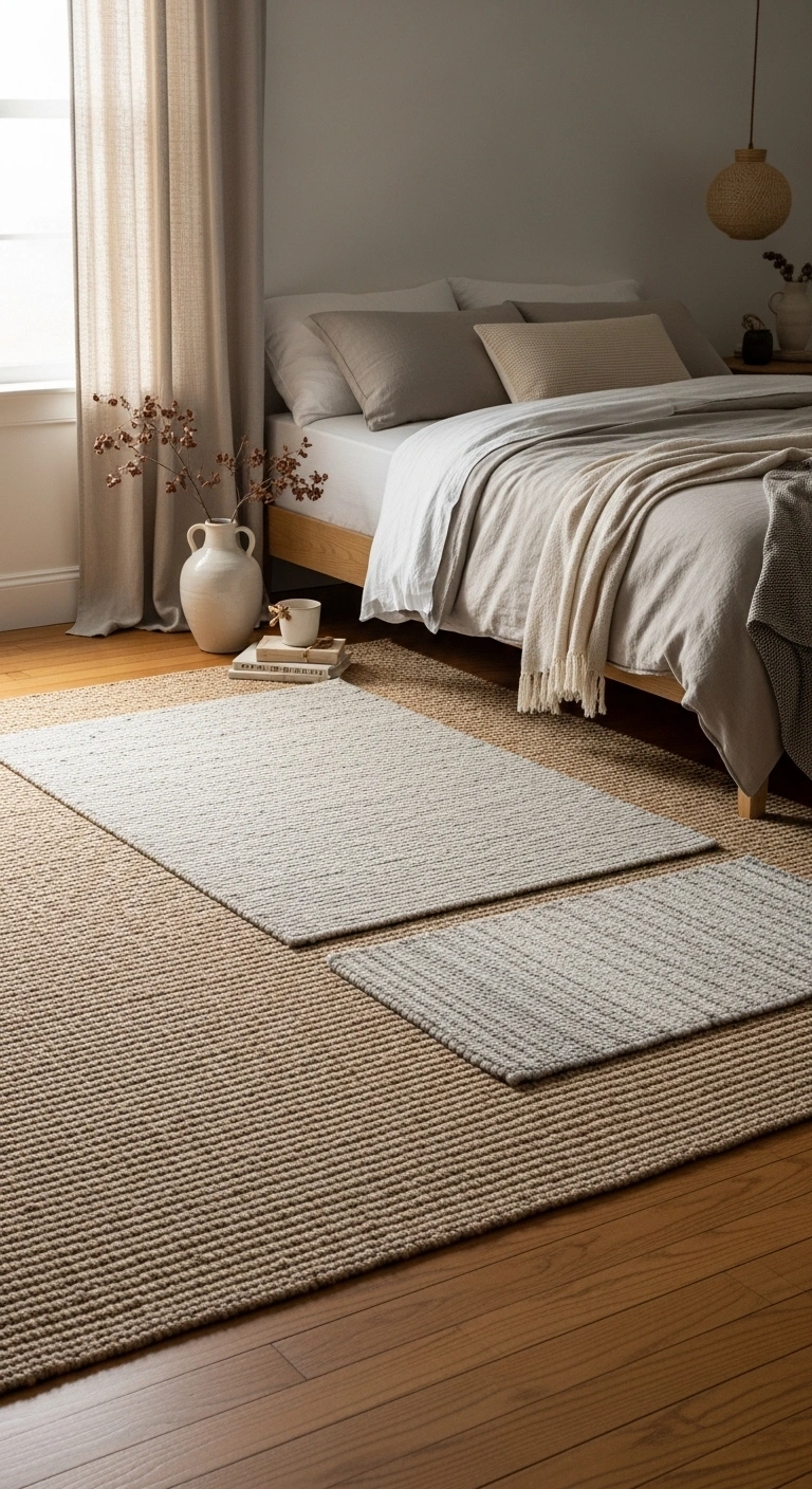 Use contrasting tones, such as a neutral base with a slightly darker or patterned top layer. This creates a cozy, lived-in feel that looks natural rather than staged. Place the rugs slightly off alignment for a relaxed look. This idea works well in both small and large bedrooms and allows easy seasonal updates by switching rugs.