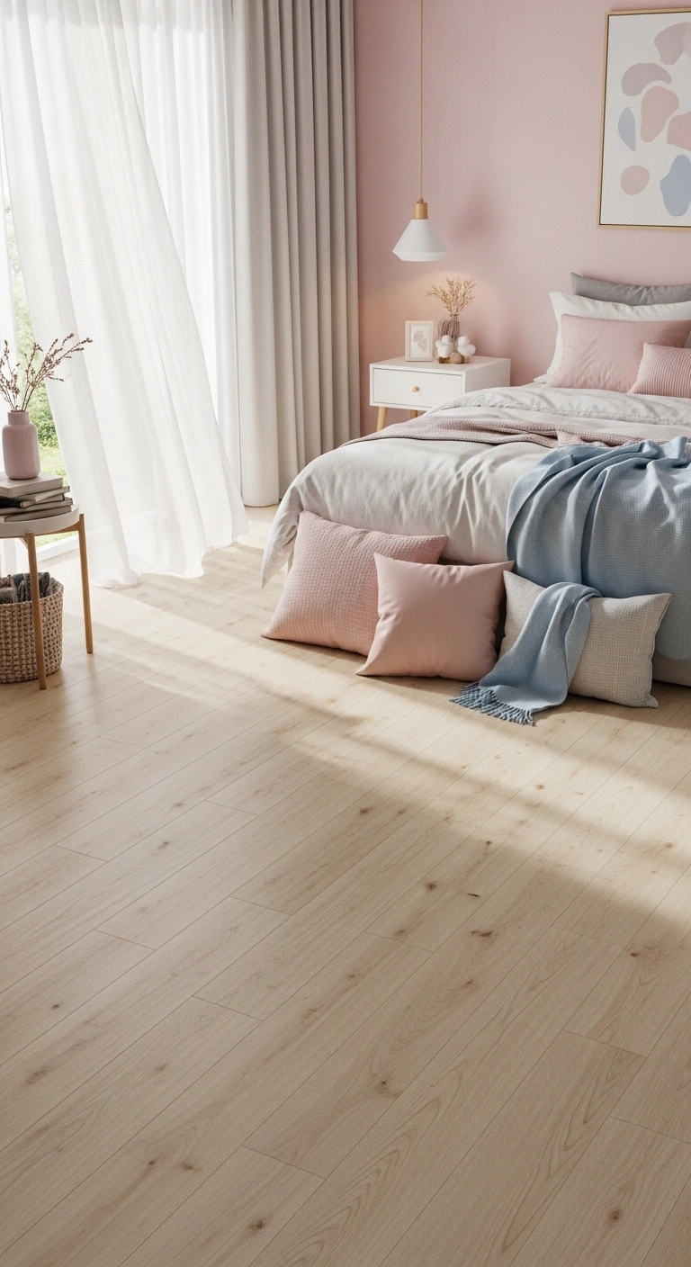 Pair this flooring with soft pastel accents like blush pink pillows or light blue throws. Add sheer curtains to let natural light flow across the floor, enhancing its brightness. Keep textures soft—linen bedding, cotton rugs, and smooth wood furniture. This setup creates a clean, airy vibe that still feels warm and comfortable.