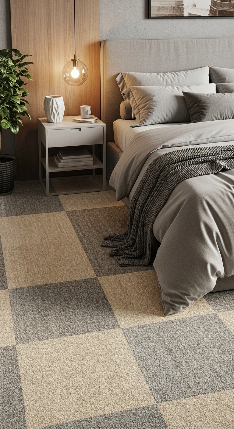 Choose tones like warm gray and soft beige, alternating them in a gentle layout. This adds visual depth while staying calm and cohesive. Carpet tiles are also practical—you can replace individual sections if needed. Add low, warm lighting and soft fabric elements like knit throws to enhance the cozy mood. This idea is perfect if you want something customizable and functional.
