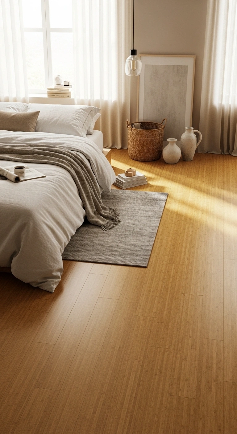 Bamboo flooring brings a clean, natural look with a slightly different grain pattern than traditional wood. Its soft golden tone adds warmth without feeling heavy.