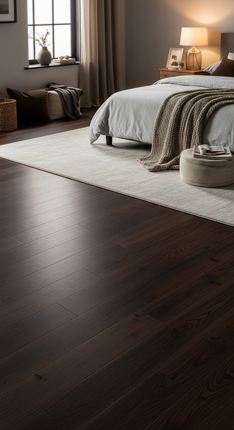 Dark wood flooring creates a rich, cozy base that makes your bedroom feel grounded and intimate. Deep walnut or espresso tones work especially well in larger rooms or spaces with good lighting.
