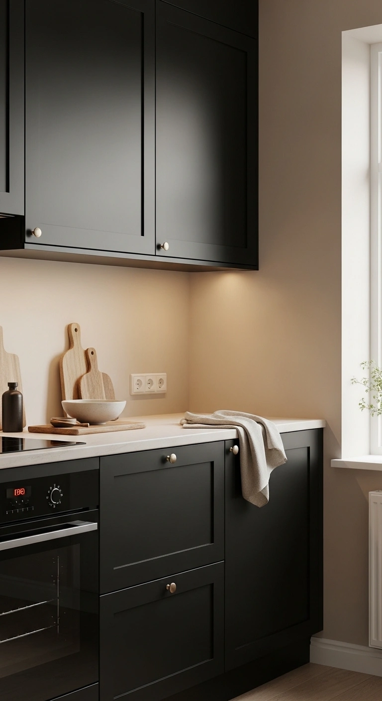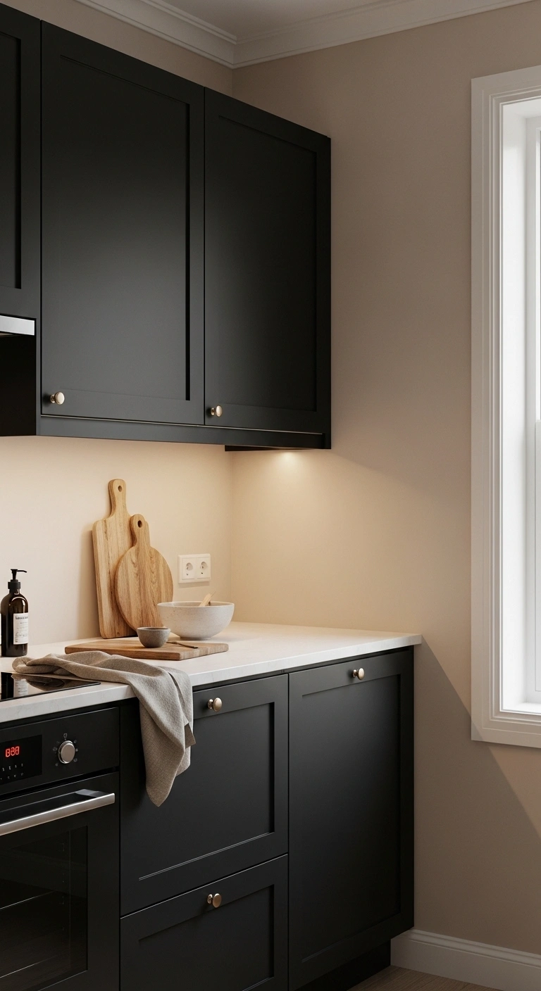 Black cabinets paired with soft beige walls create a calm and welcoming kitchen that feels balanced. The beige tone lightens the overall look and keeps the black from feeling too strong. This pairing works well in spaces with limited natural light because the walls help reflect brightness across the room.