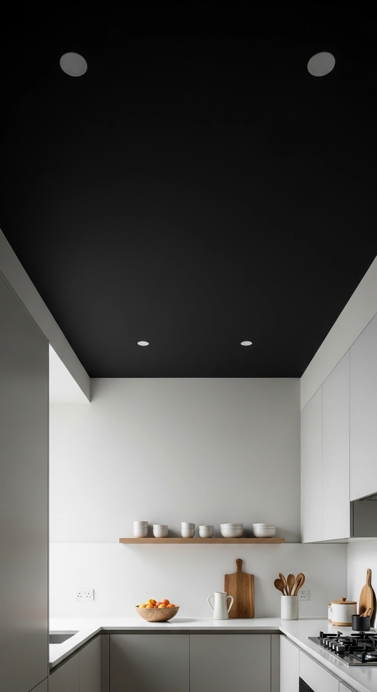 A black ceiling adds depth and creates a framed feeling in the kitchen without overwhelming the space. When paired with lighter walls and cabinets, it draws the eye upward and gives the room a unique character. This idea works especially well in kitchens with high ceilings.