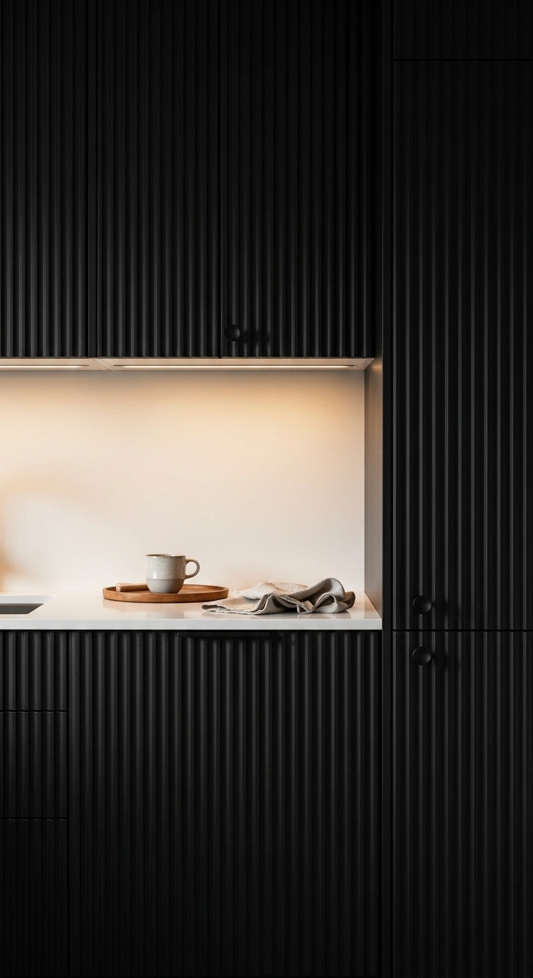 Fluted black cabinets add texture and movement, making the kitchen feel more dynamic. The vertical lines catch light differently throughout the day, preventing the surface from looking flat. This detail adds interest without needing extra decoration.
