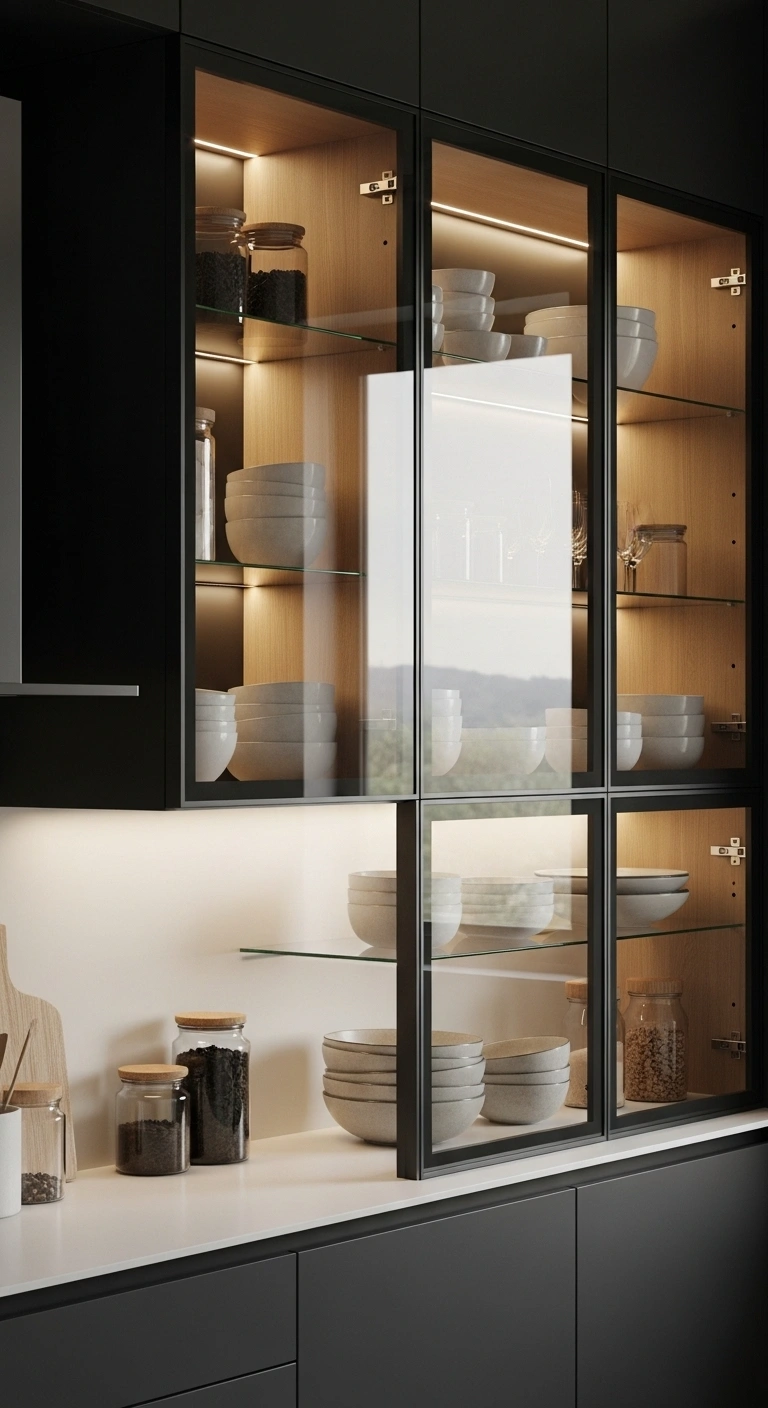 Black cabinets mixed with glass-front doors create a lighter and more open look. The glass breaks up the solid black and allows you to display simple and neat items inside. This makes the kitchen feel more personal and less heavy.