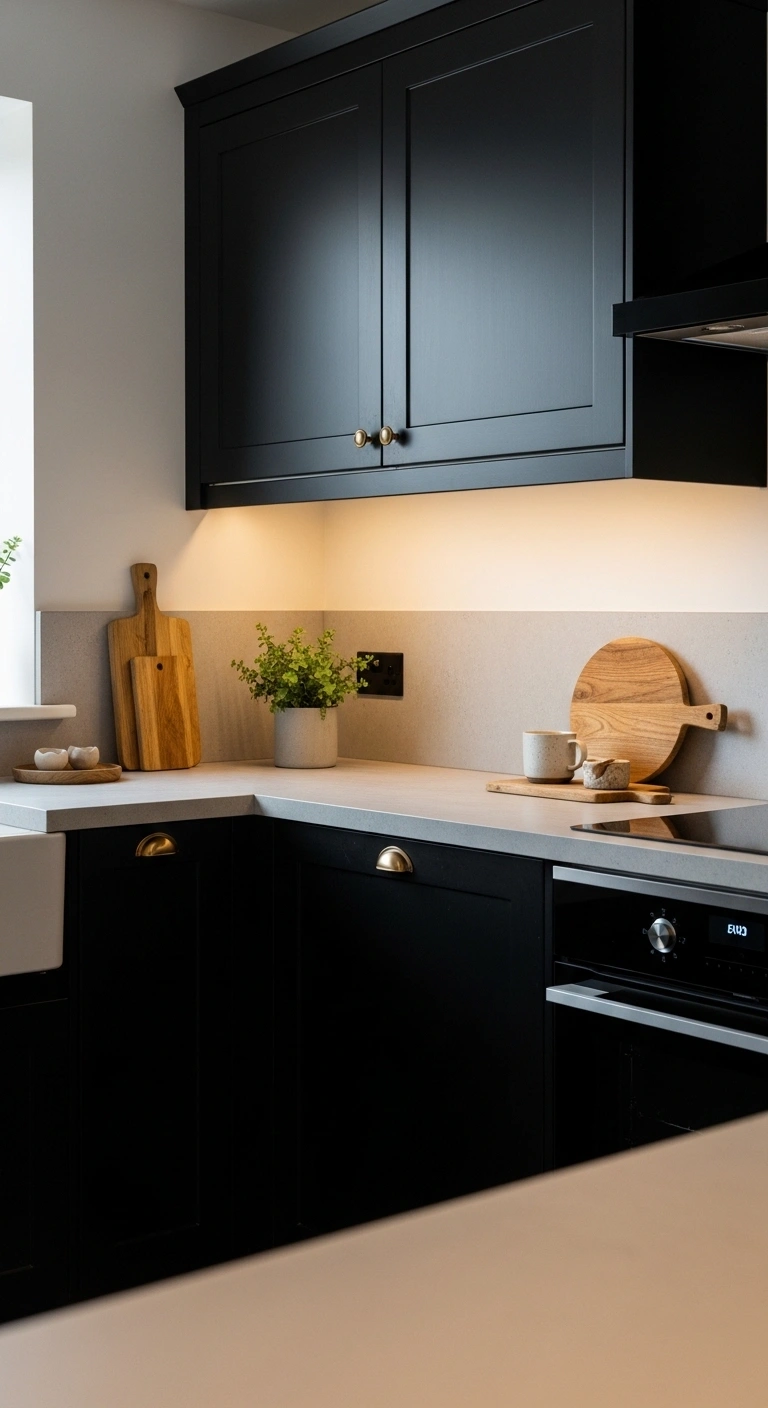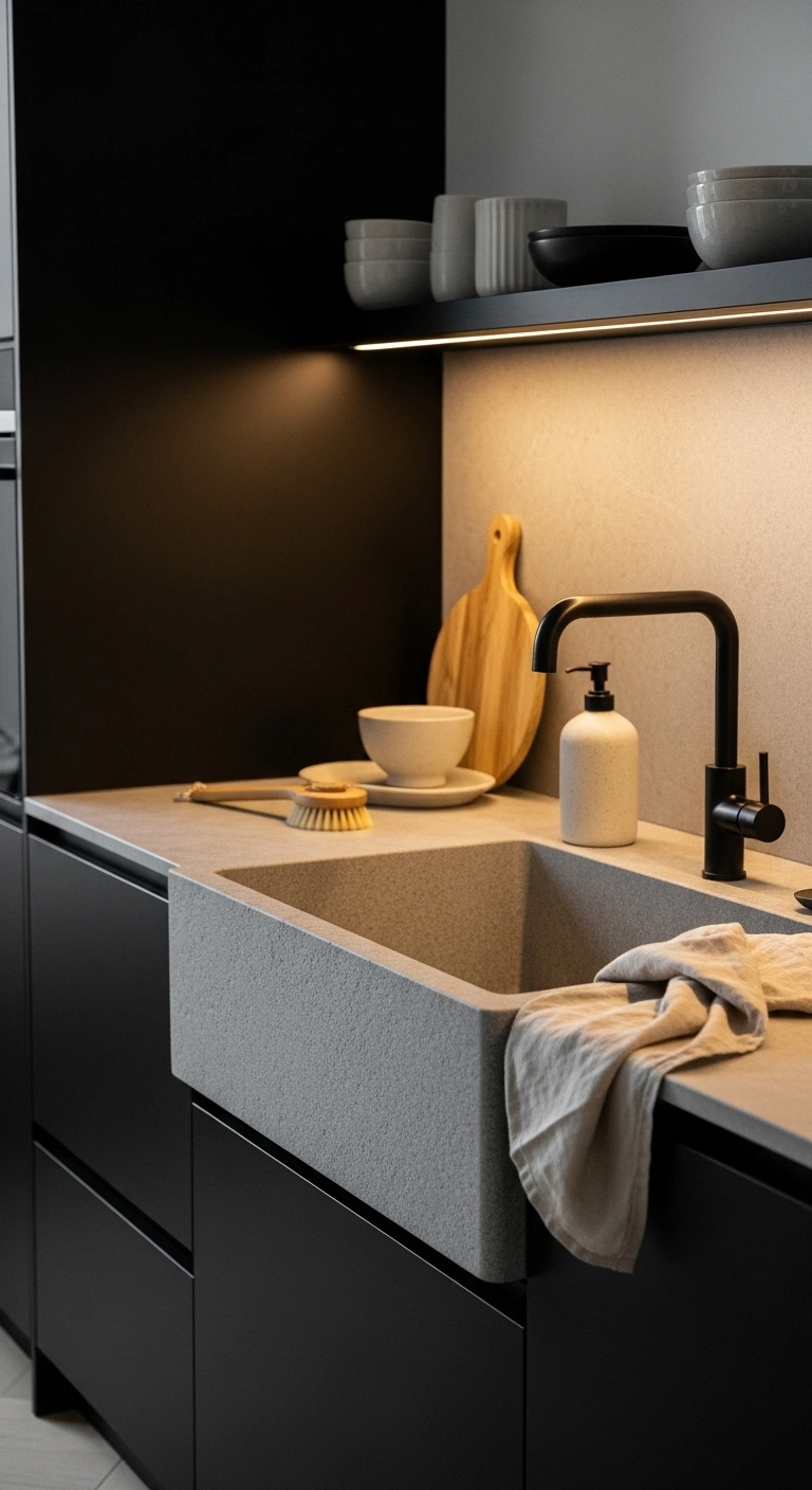 Black cabinets paired with light concrete countertops create a modern and grounded look. The soft gray tone of concrete balances the depth of black and adds a natural feel. This combination works well in both urban and simple home styles.