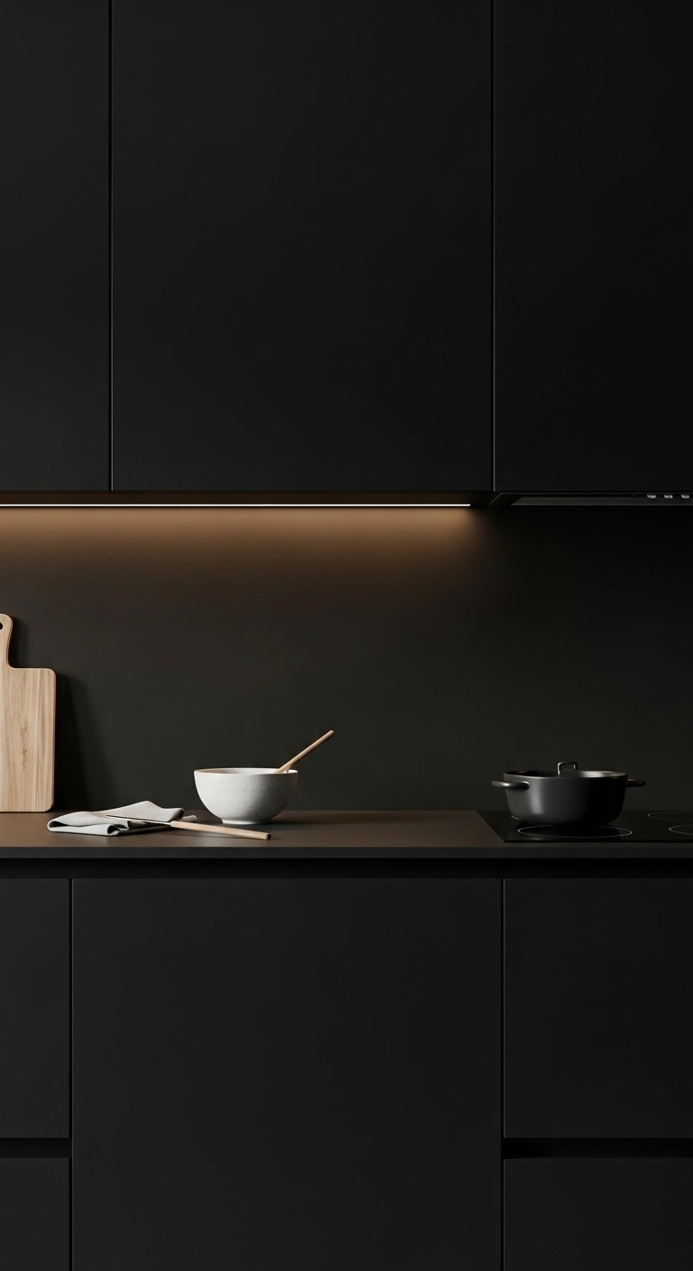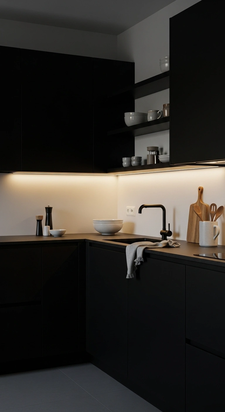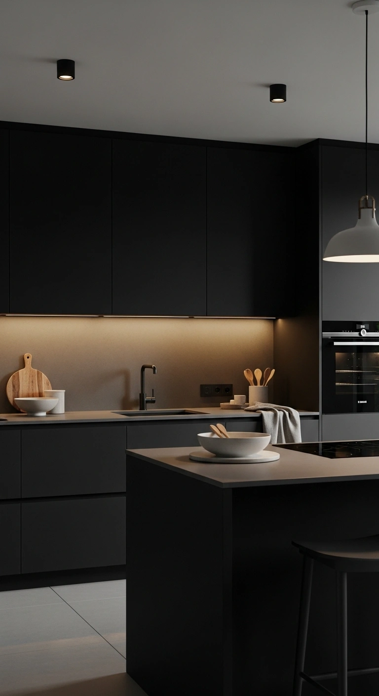 Choose matte finishes to avoid too much glare and add subtle textures like ribbed cabinet fronts or stone backsplashes. Keep the floor slightly lighter to ground the design and add contrast. This approach turns a fully black kitchen into a warm and inviting space rather than a dark one.