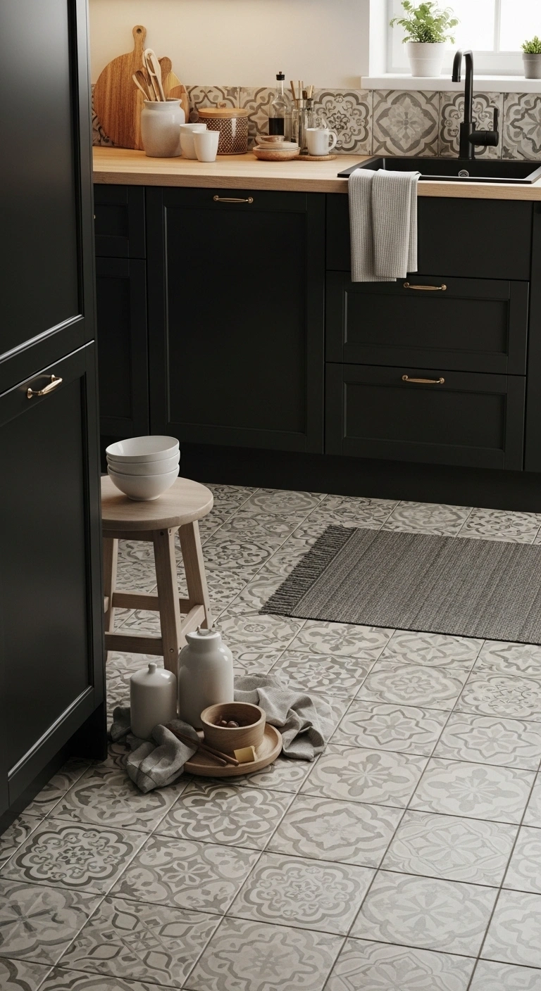 Patterned floor tiles bring life to a black kitchen and prevent it from feeling too plain. Choose tiles with soft tones like white, gray, or beige to keep the look balanced. The pattern adds visual interest without needing extra decor.