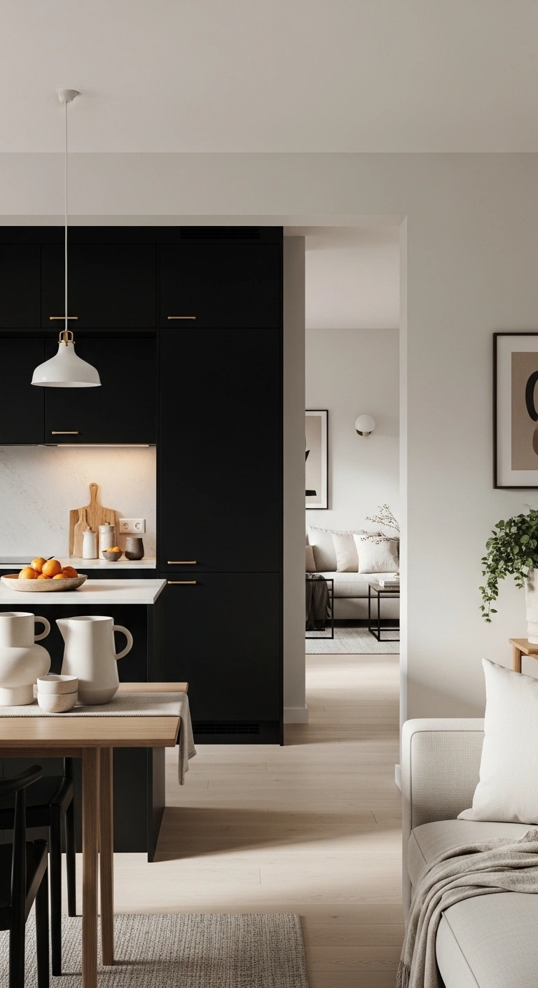Black cabinets work well in open layouts when balanced with lighter surrounding spaces. Use black in the kitchen area and keep the dining or living area lighter to create contrast. This helps define the kitchen without closing it off.