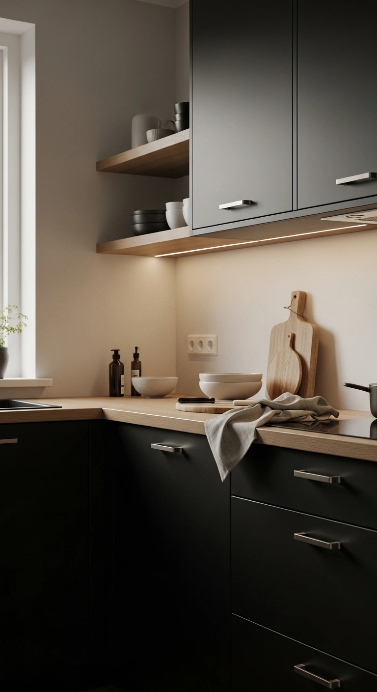 Matte black cabinets create a calm and confident look that never feels too loud. Pair them with warm wood elements like oak shelves or walnut countertops to soften the dark tone and keep the kitchen inviting. The mix of deep black and natural wood brings balance, making the space feel both modern and grounded. Use soft lighting under cabinets to highlight the wood grain and prevent the black from looking flat or heavy.
