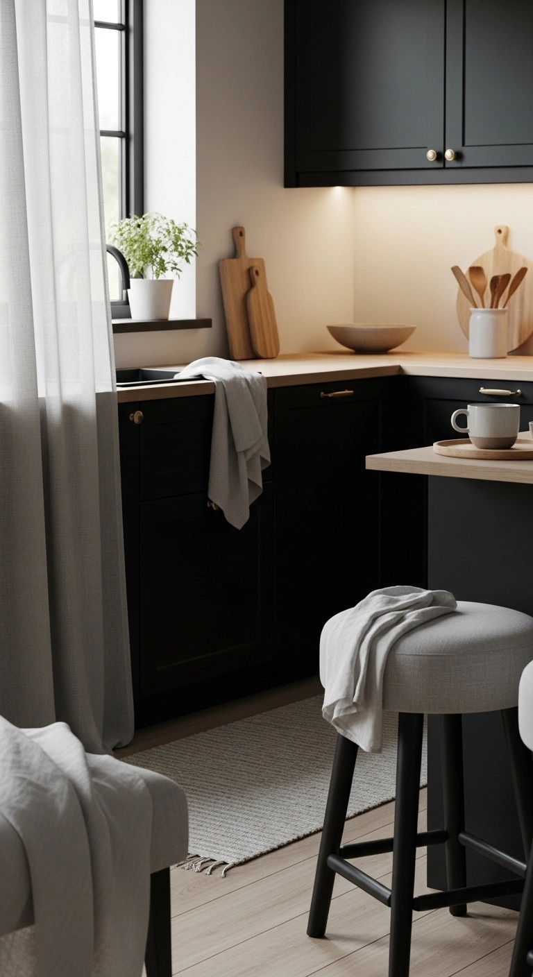 Soft fabric elements like curtains, cushions, or upholstered stools add warmth to a black kitchen. These textures break the hardness of dark surfaces and make the space feel more comfortable. Choose neutral fabrics to keep the look calm.