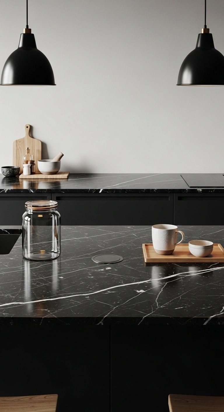 Black marble countertops with soft white or gold veins add a rich and timeless feel to any kitchen. The natural patterns create movement, so the space never feels dull or flat. Pair the marble with simple black or dark gray cabinets to let the stone stand out as the main feature. Use warm pendant lighting above the counter to enhance the natural shine and bring out the details in the veining.